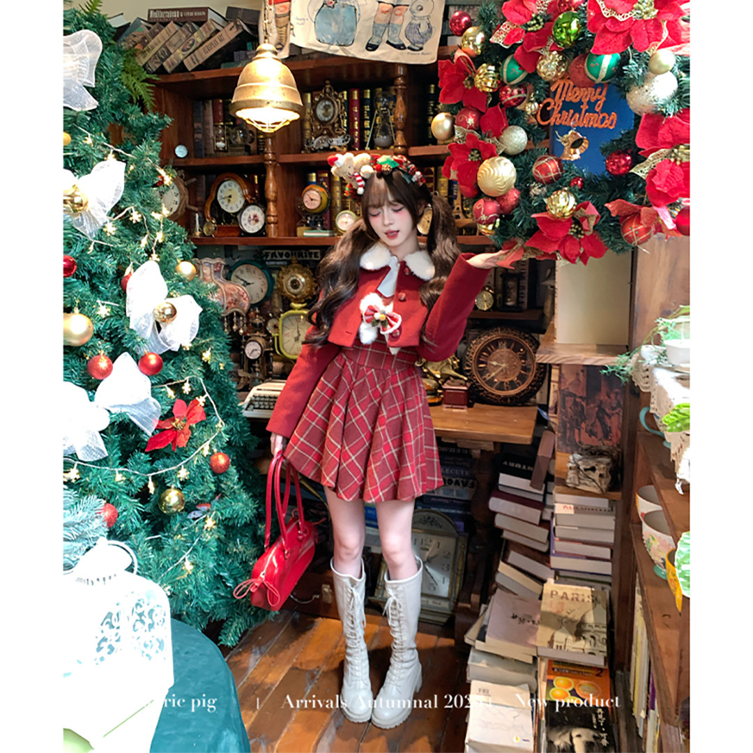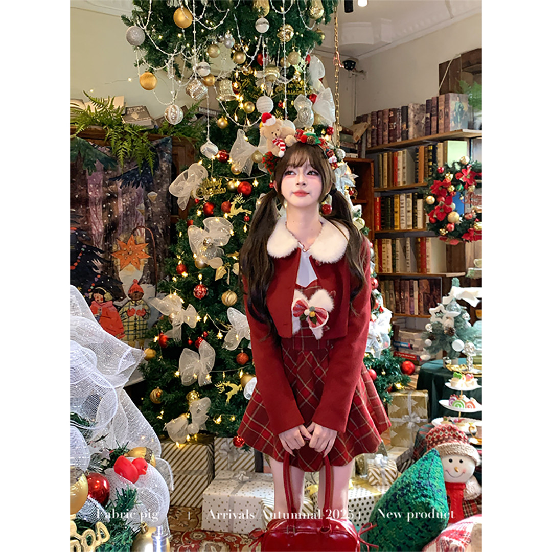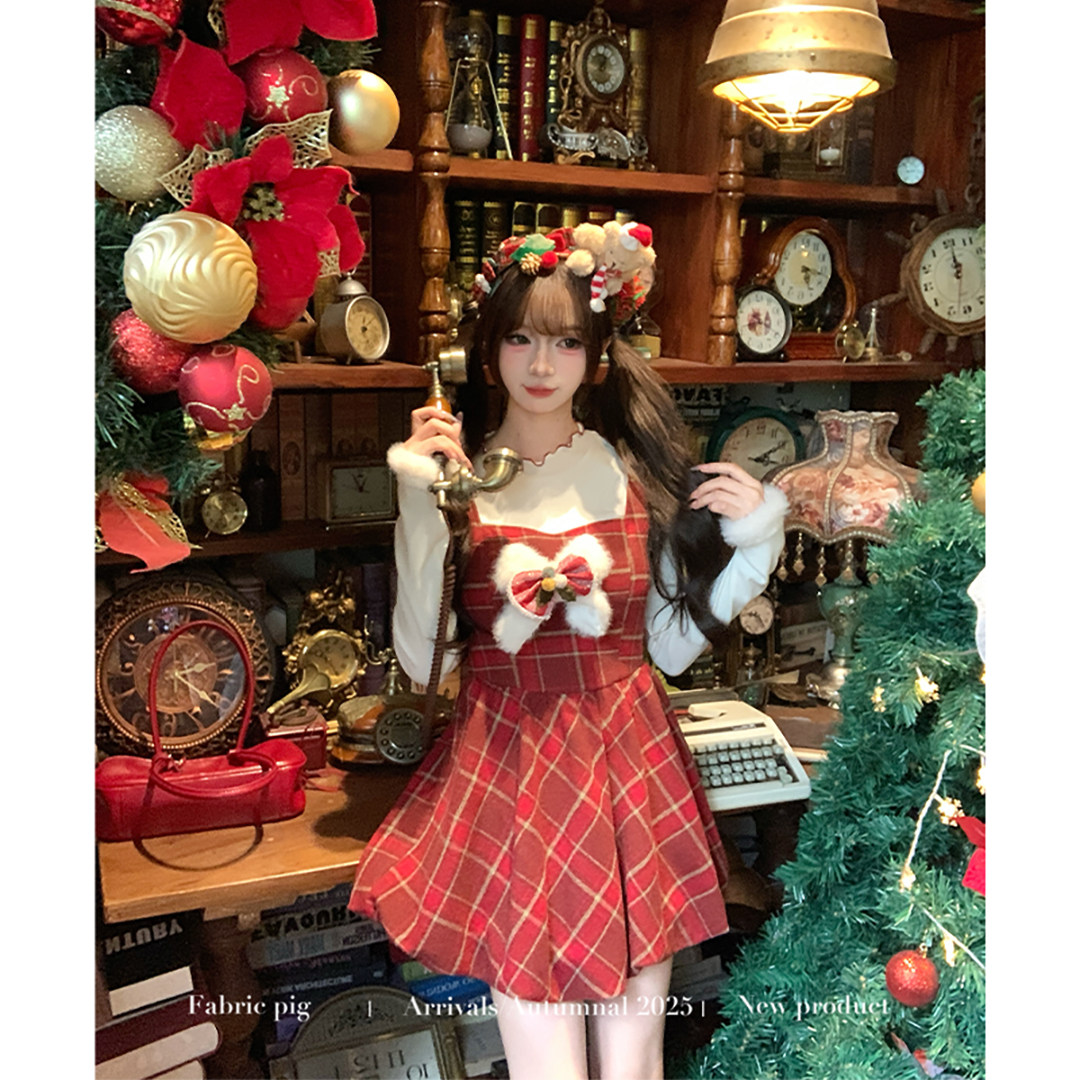 织物猪 限定圣诞 甜美红色格纹花苞裙女冬季蝴蝶结设计三件套穿搭