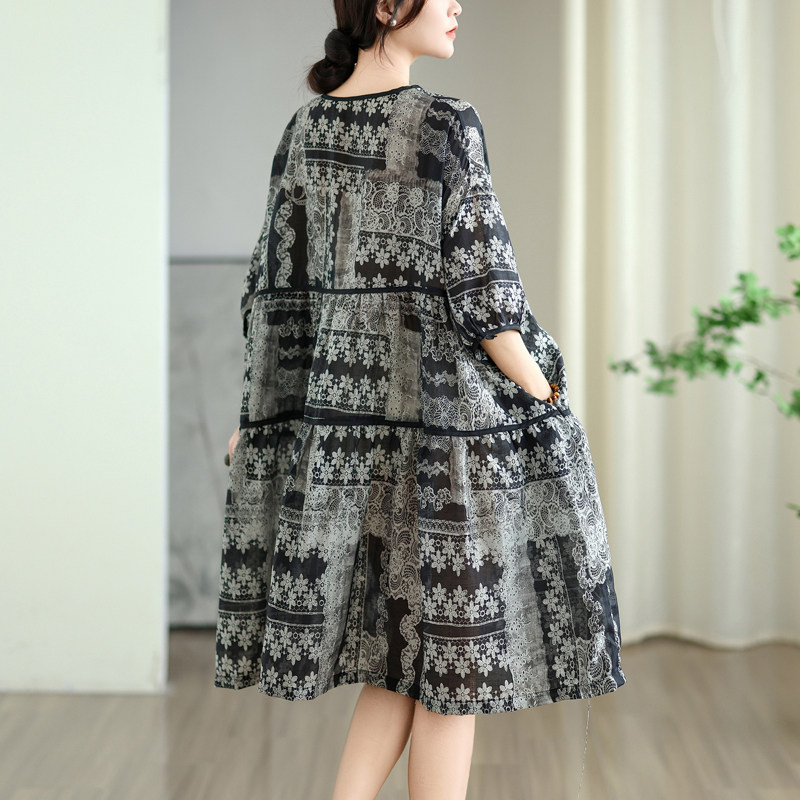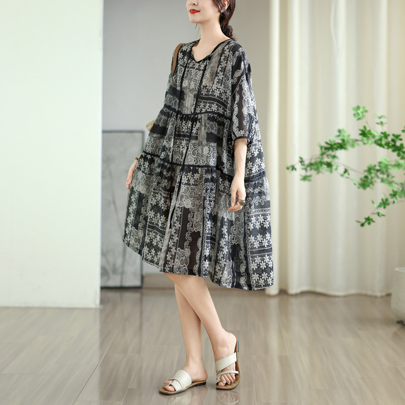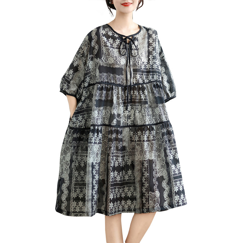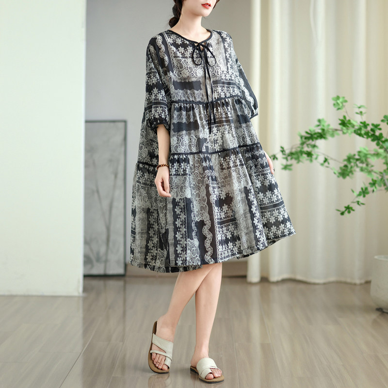 大码女装夏季V领系带灯笼袖娃娃裙宽松遮肚显瘦棉麻印花连衣裙子