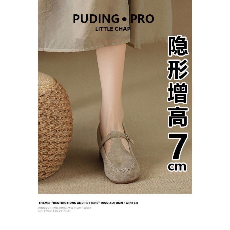 真皮版~7cm小个子内增高玛丽珍鞋女2026年新款粗跟绒面一字带单鞋
