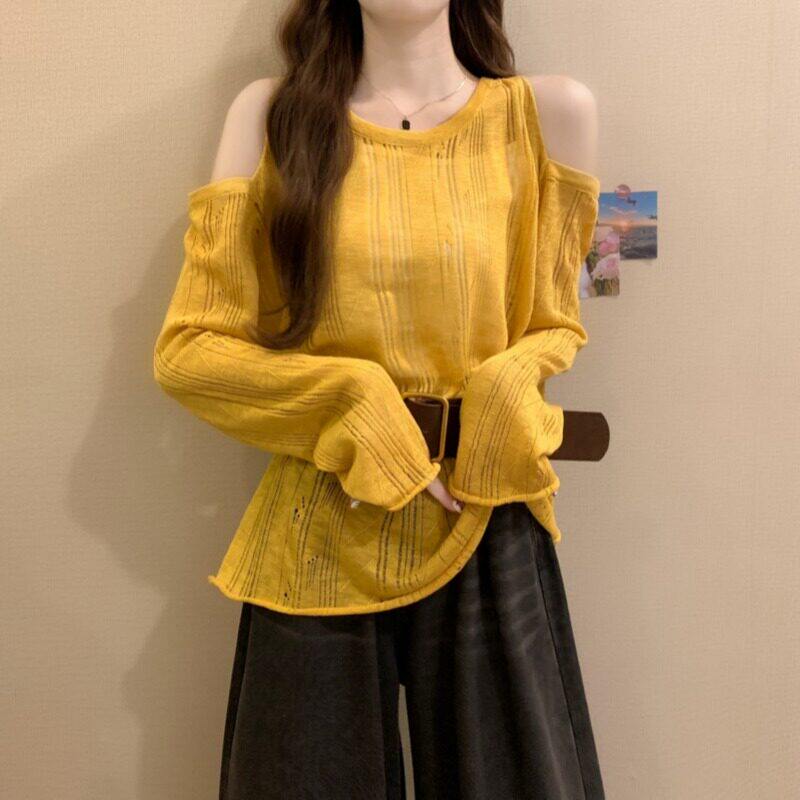 春装女款2026新款爆款镂空针织衫薄款露肩多巴胺长袖显瘦掐腰上衣