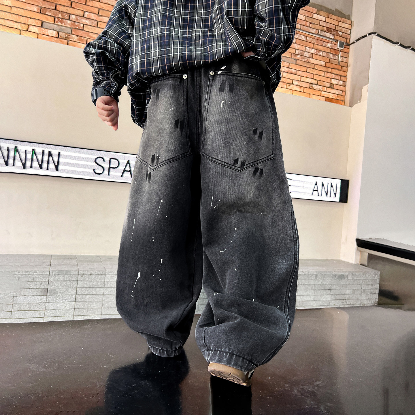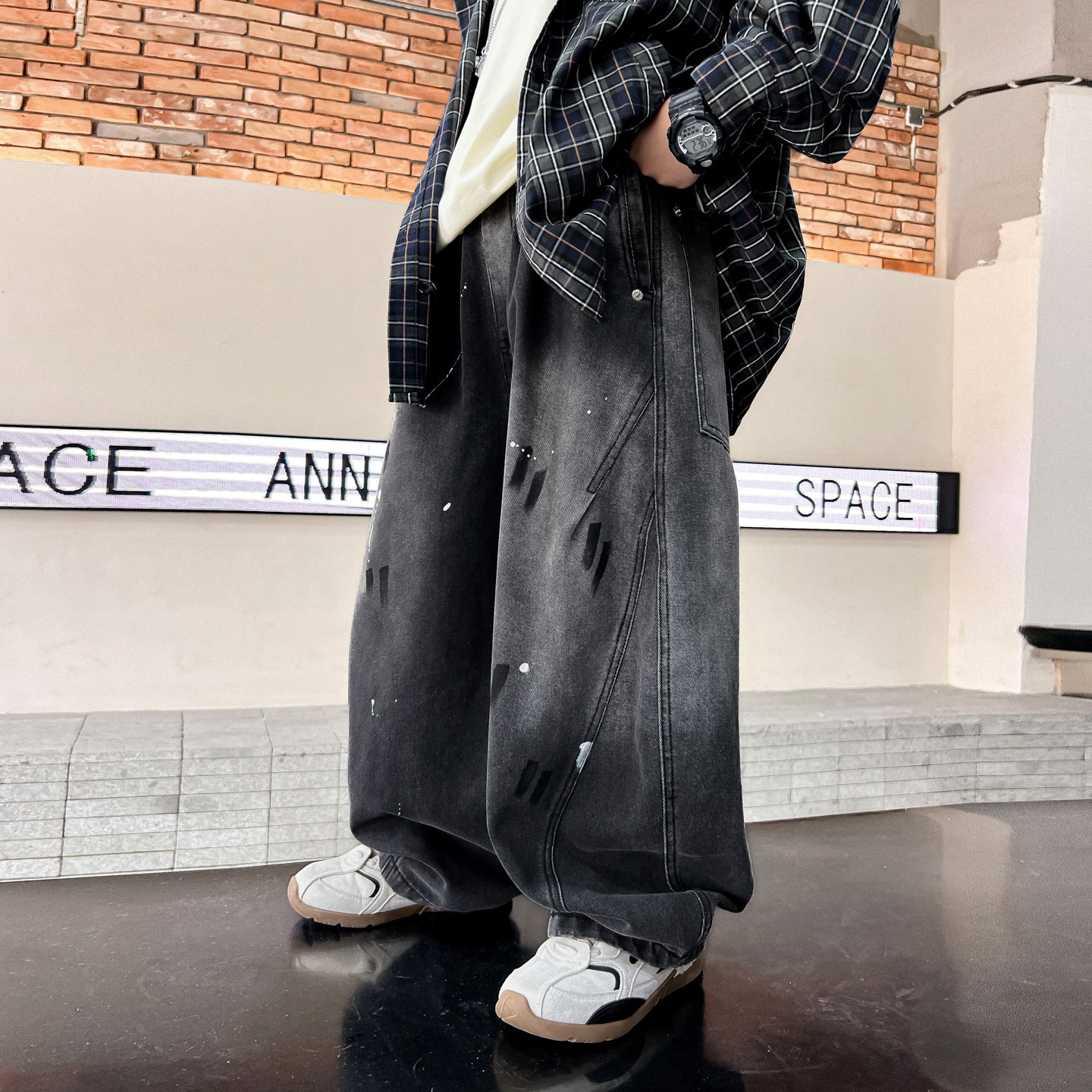 男童春季泼墨阔腿黑色弯刀牛仔裤2026新款儿童男孩直筒宽松裤子潮