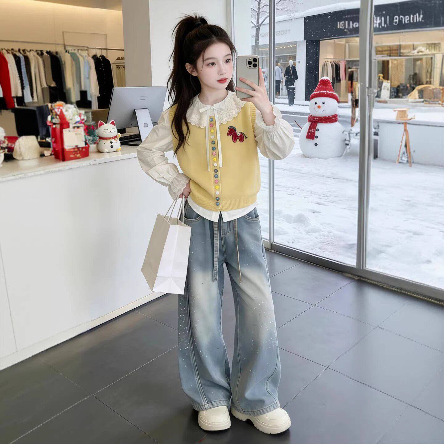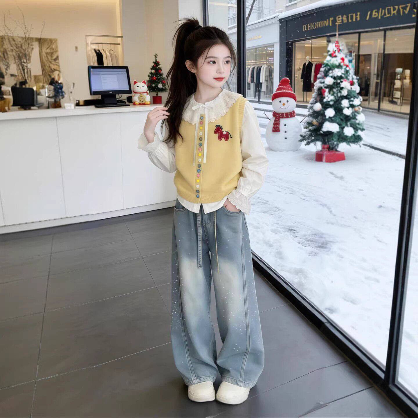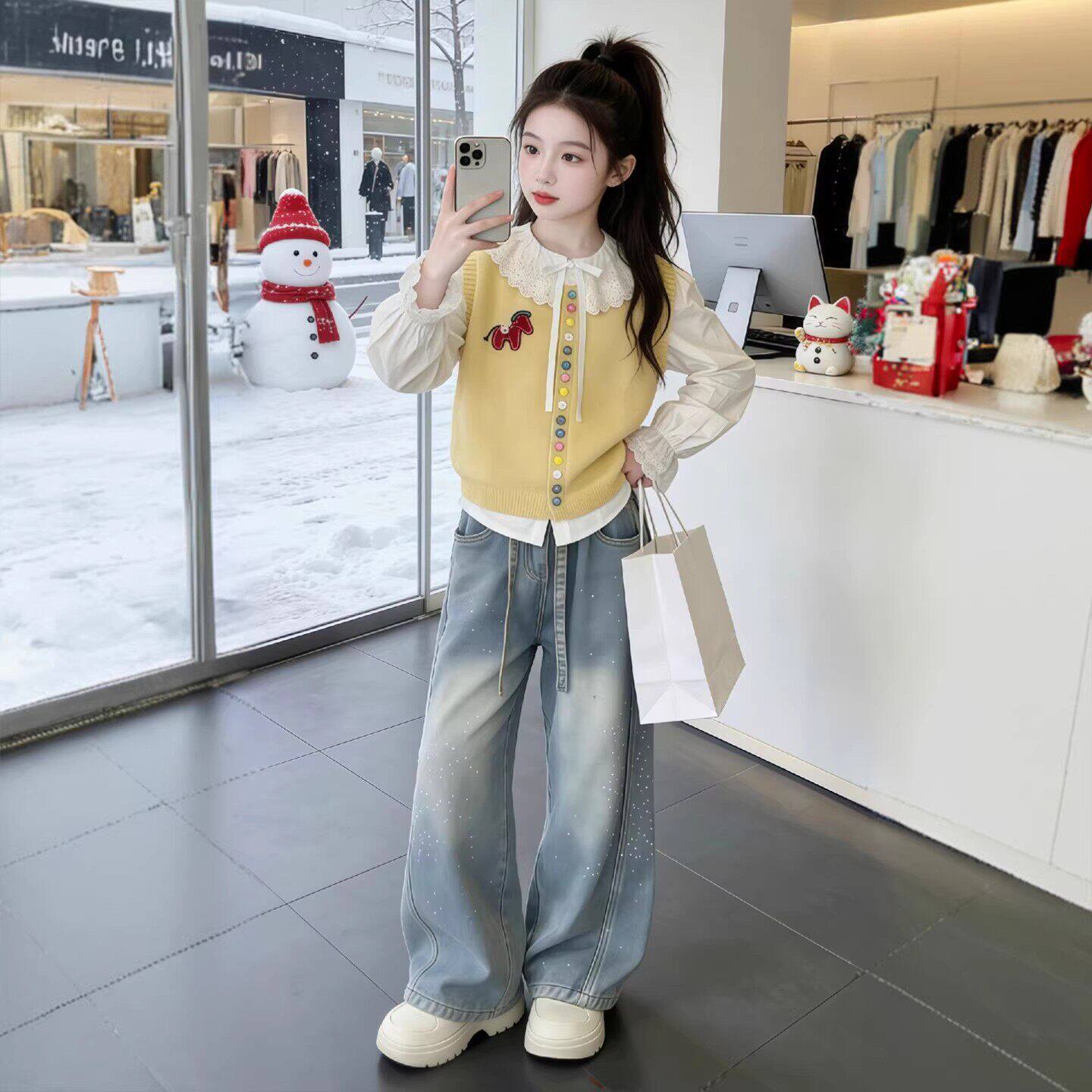 花边马甲衬衫女童洋气新款儿童春装针织2026三件套套装春秋季女孩
