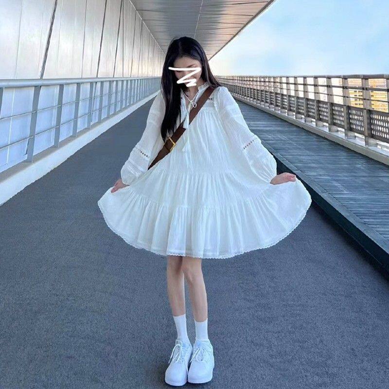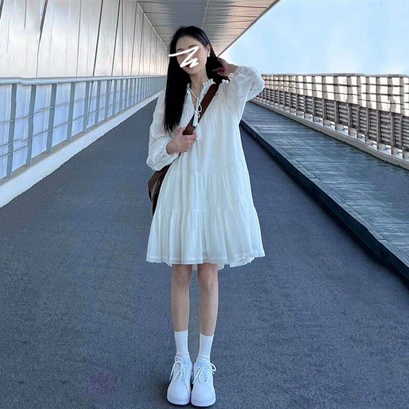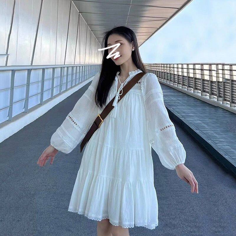 法式白色长袖连衣裙女装秋季新款小个子高级感小香风显瘦度假风裙