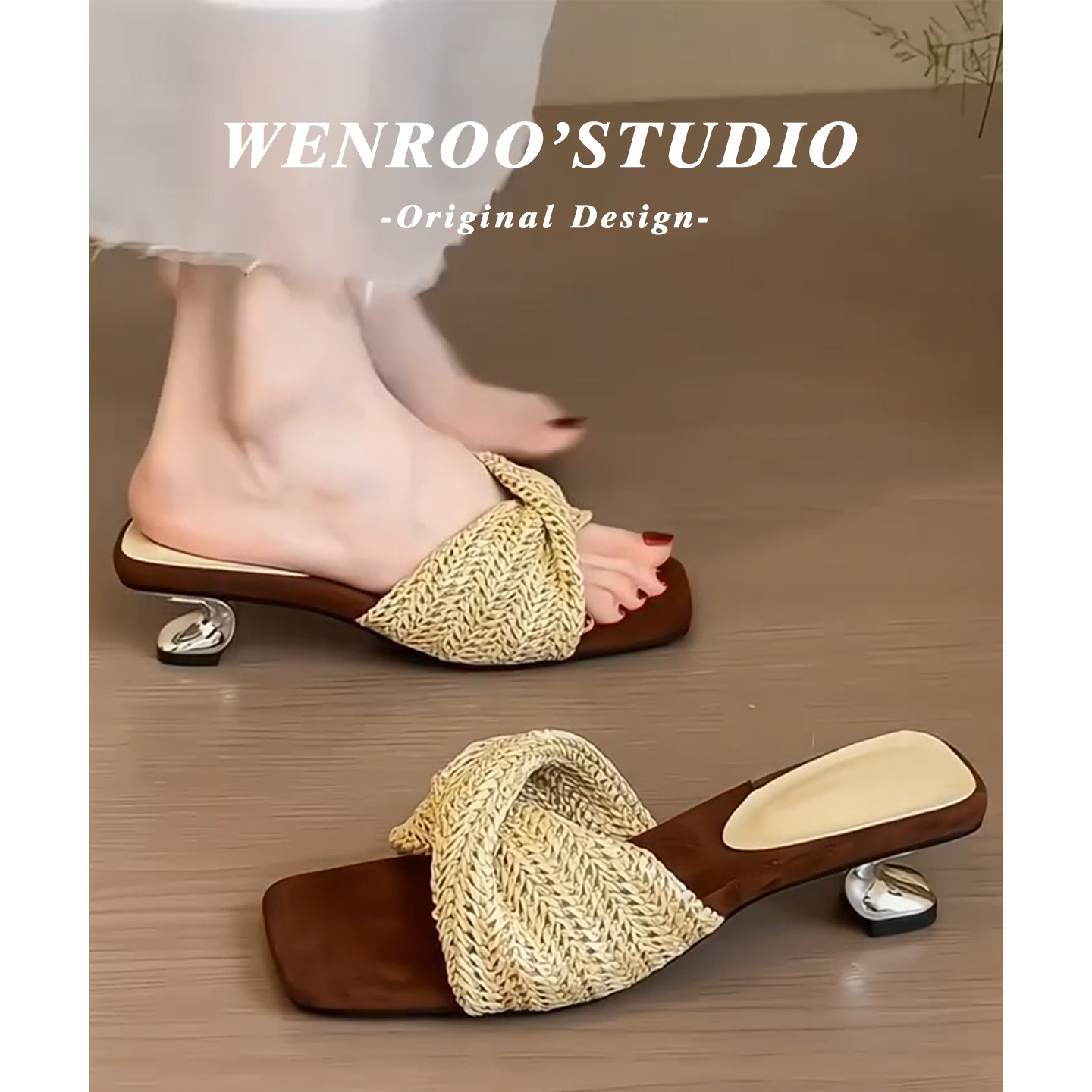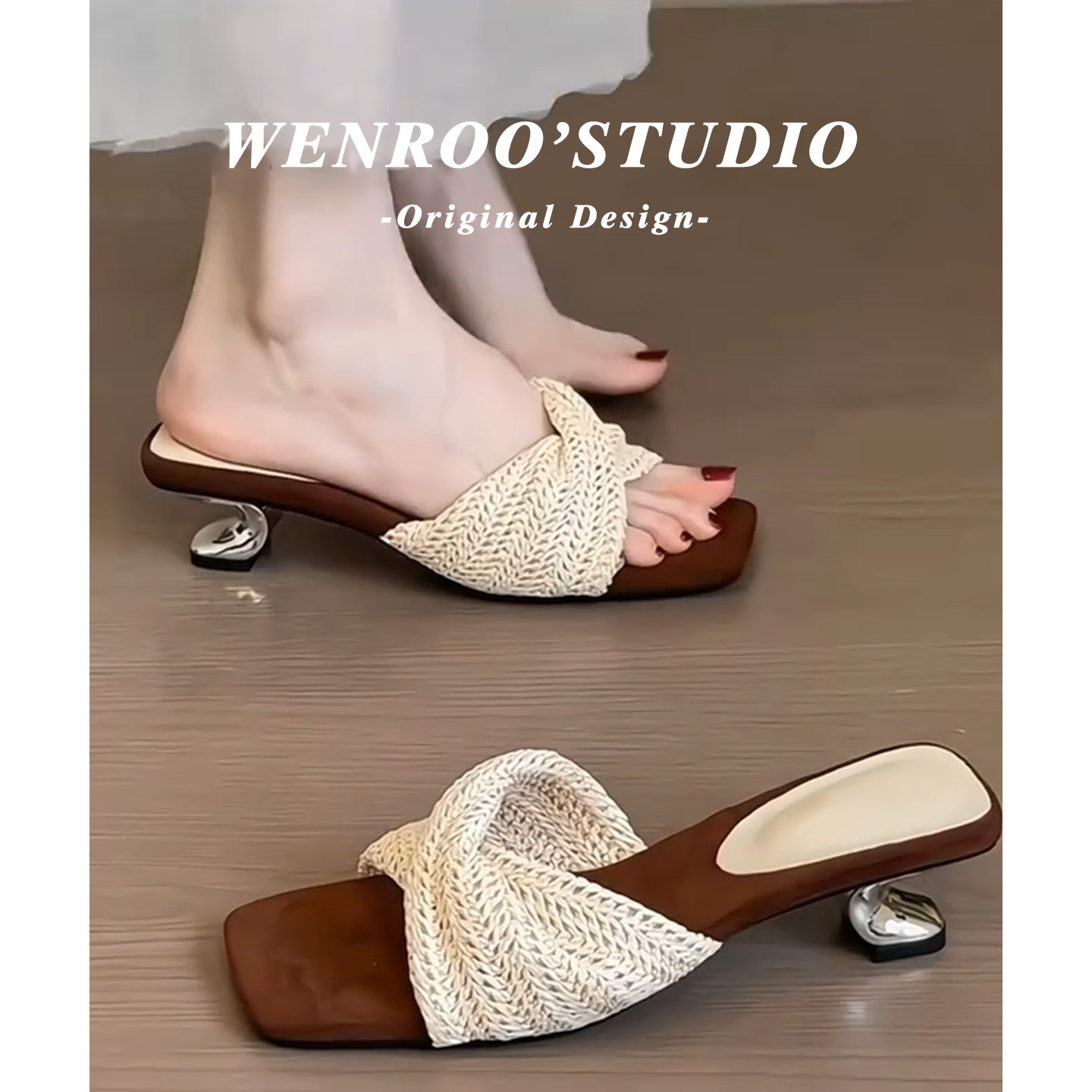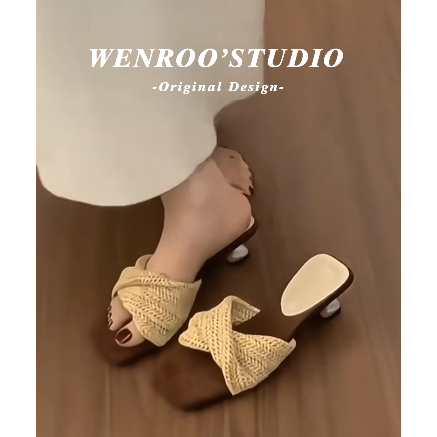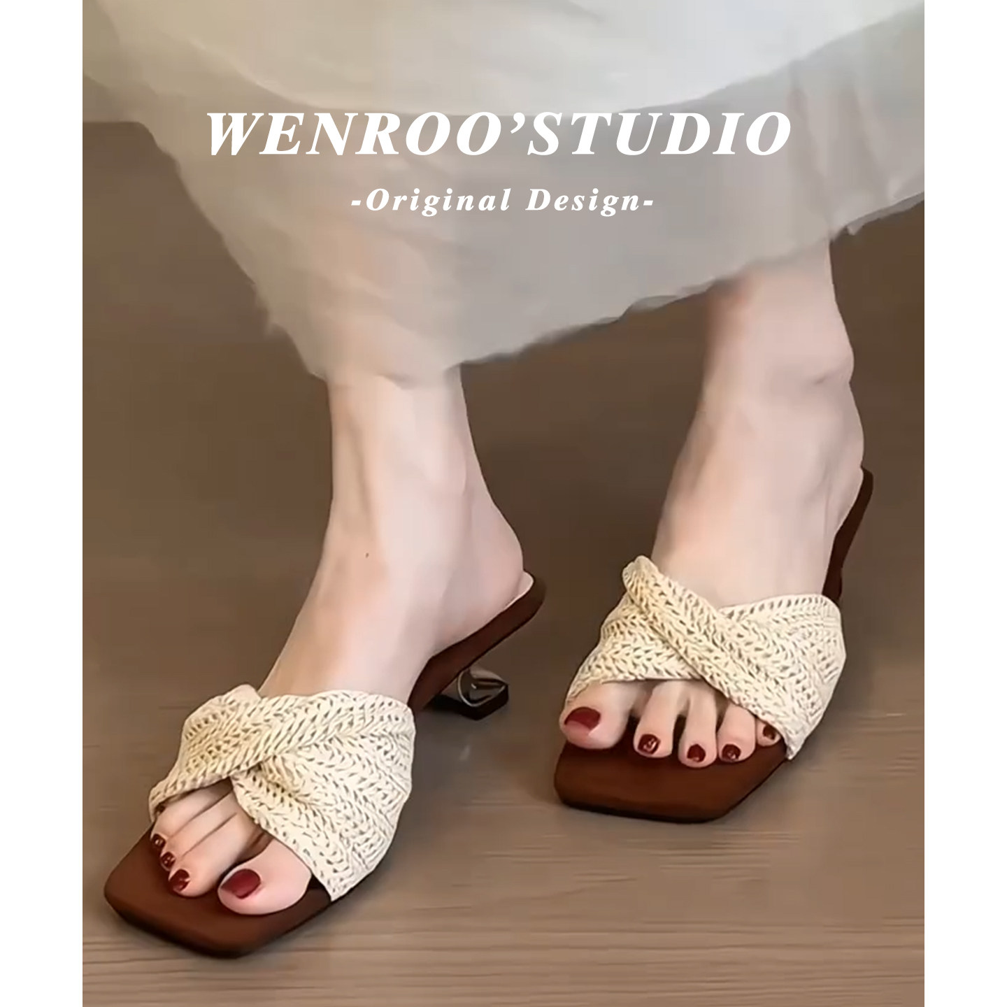 设计感编织一字带高跟拖鞋女外穿2026夏季新款法式杏色露趾凉拖鞋