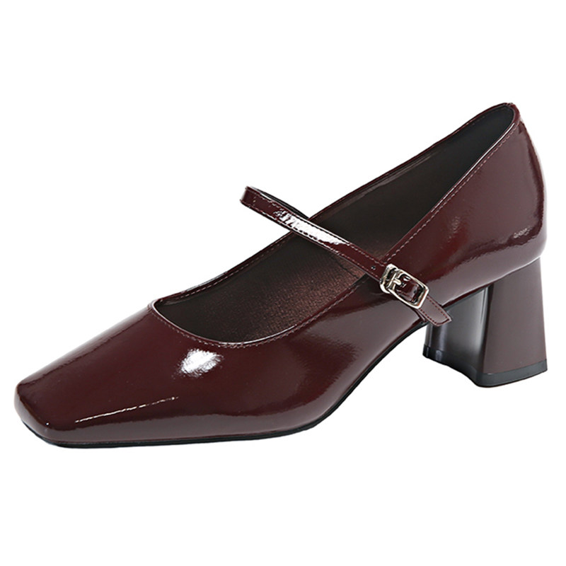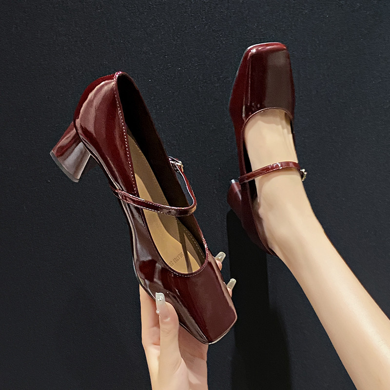 2026春夏季新款粗跟单鞋女漆皮方头浅口玛丽珍配裙子一字扣高跟鞋