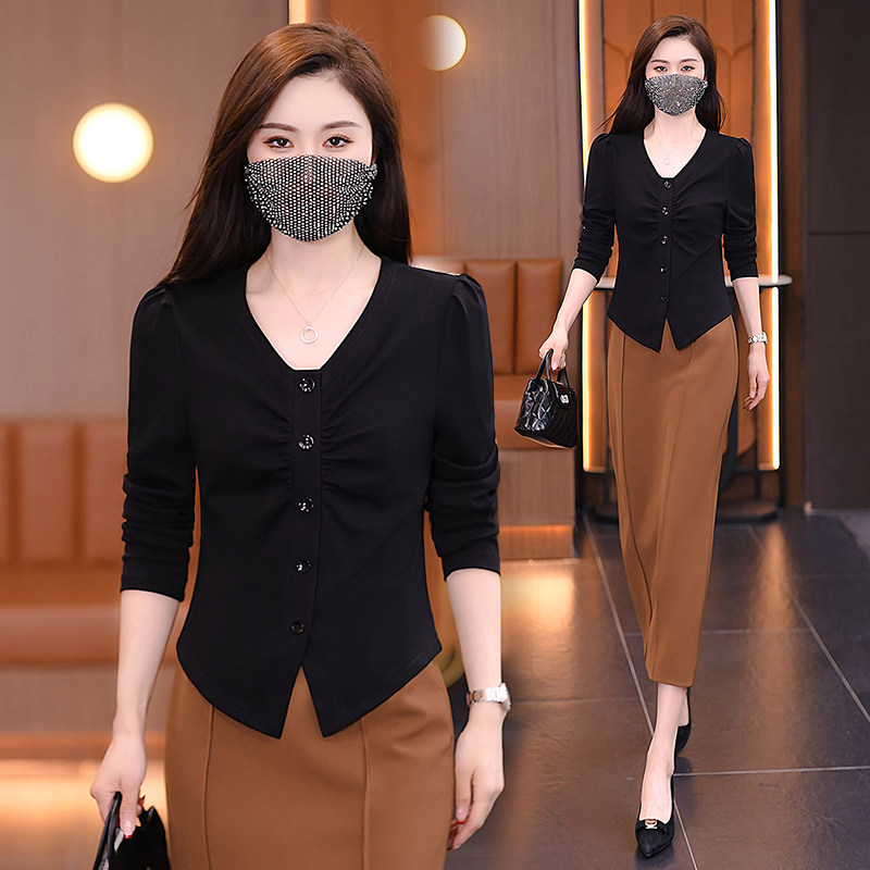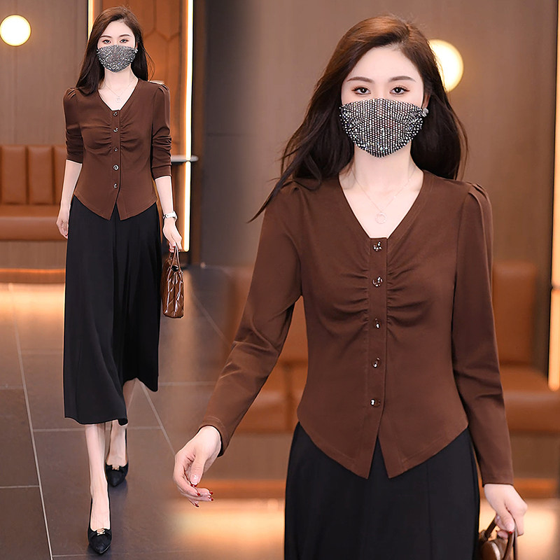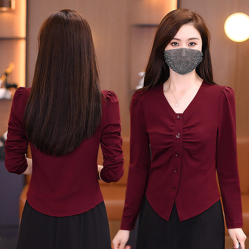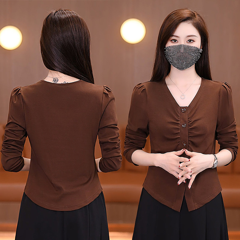 不规则长袖t恤女春款2026年新款时尚洋气小衫修身显瘦V领褶皱上衣