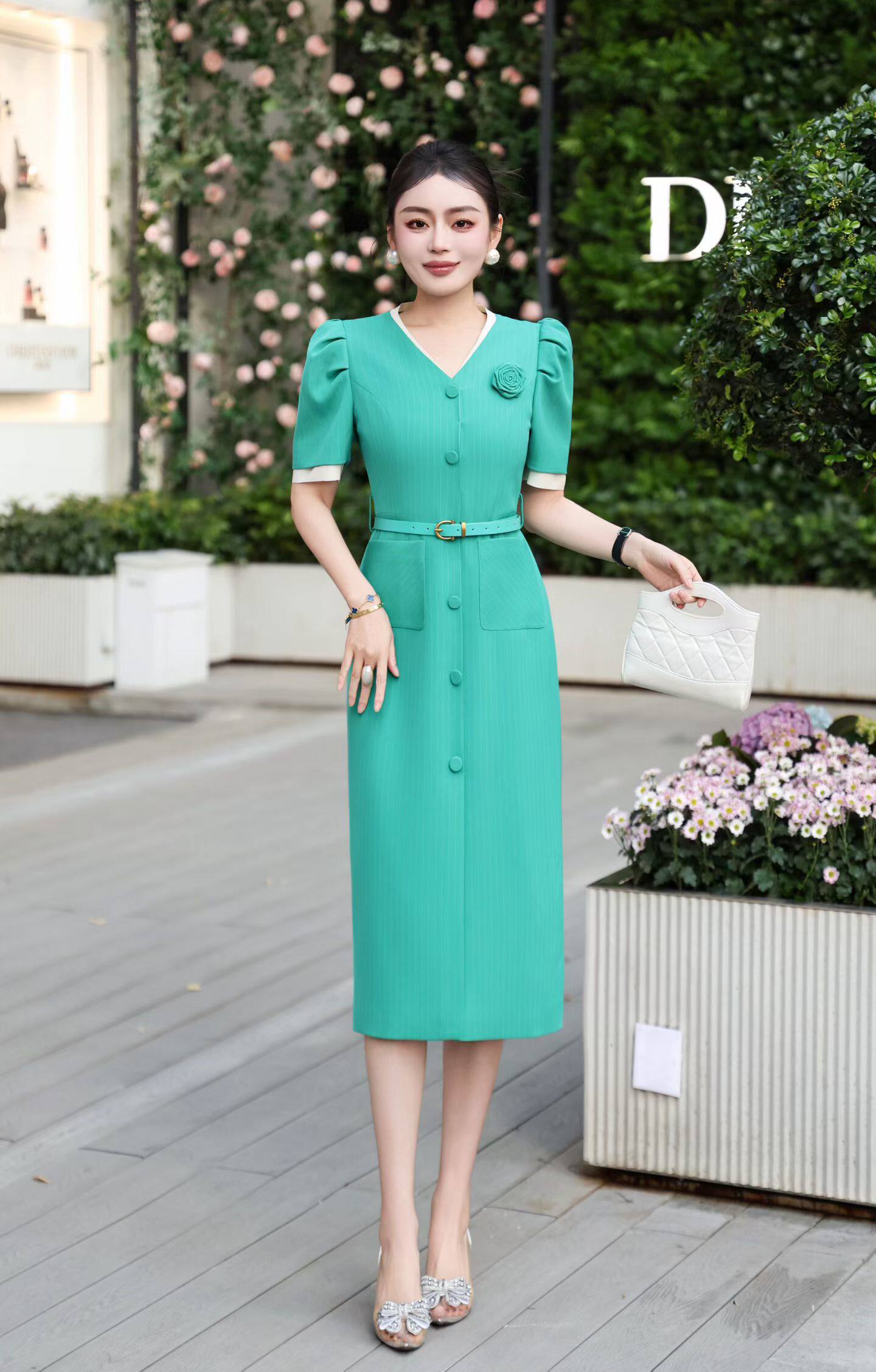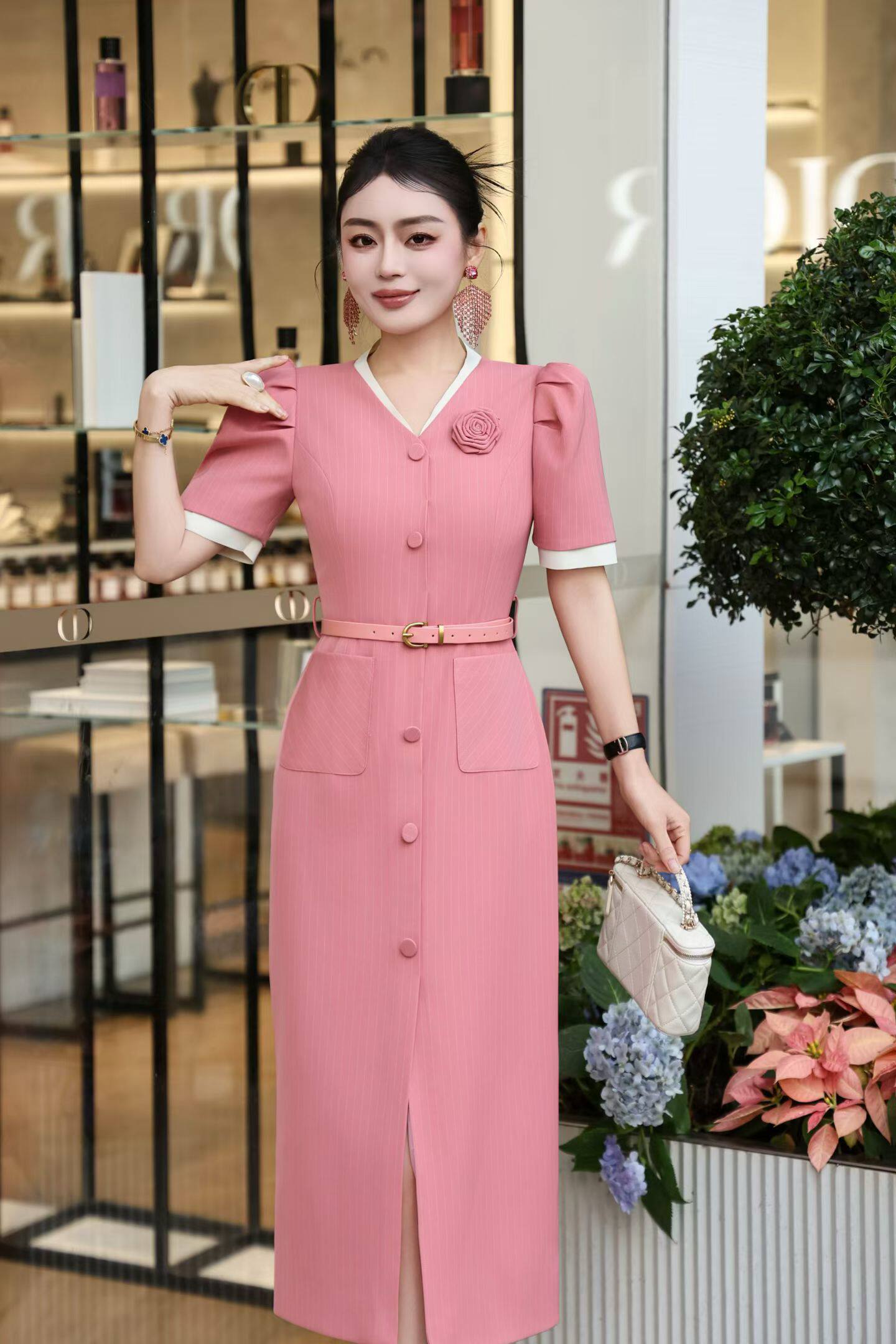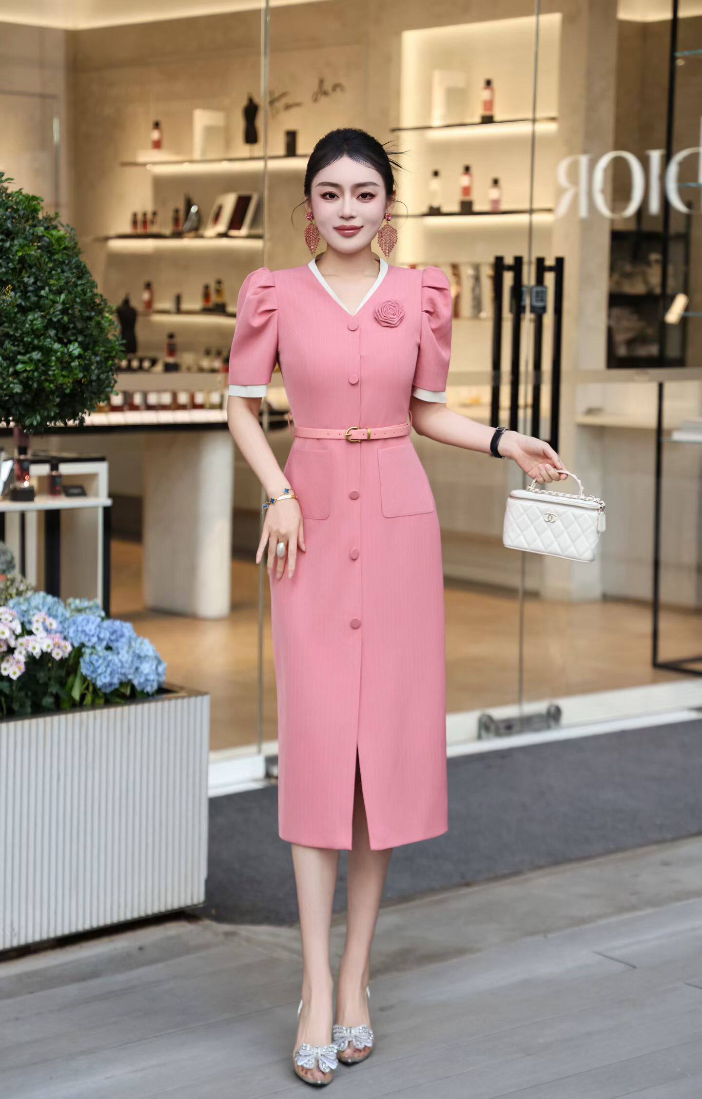 26年新款连衣裙春夏秋简约v领拼色配胸花系腰带修身显瘦一步裙
