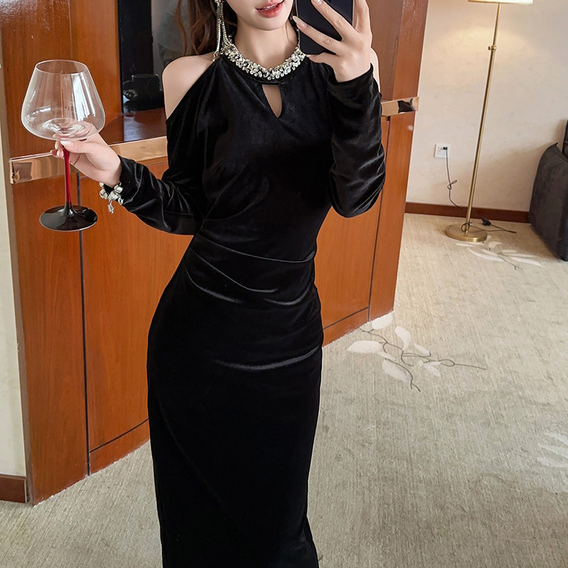 轻奢高级感丝绒钉钻挂脖连衣裙女黑色长袖露肩收腰修身显瘦长裙冬