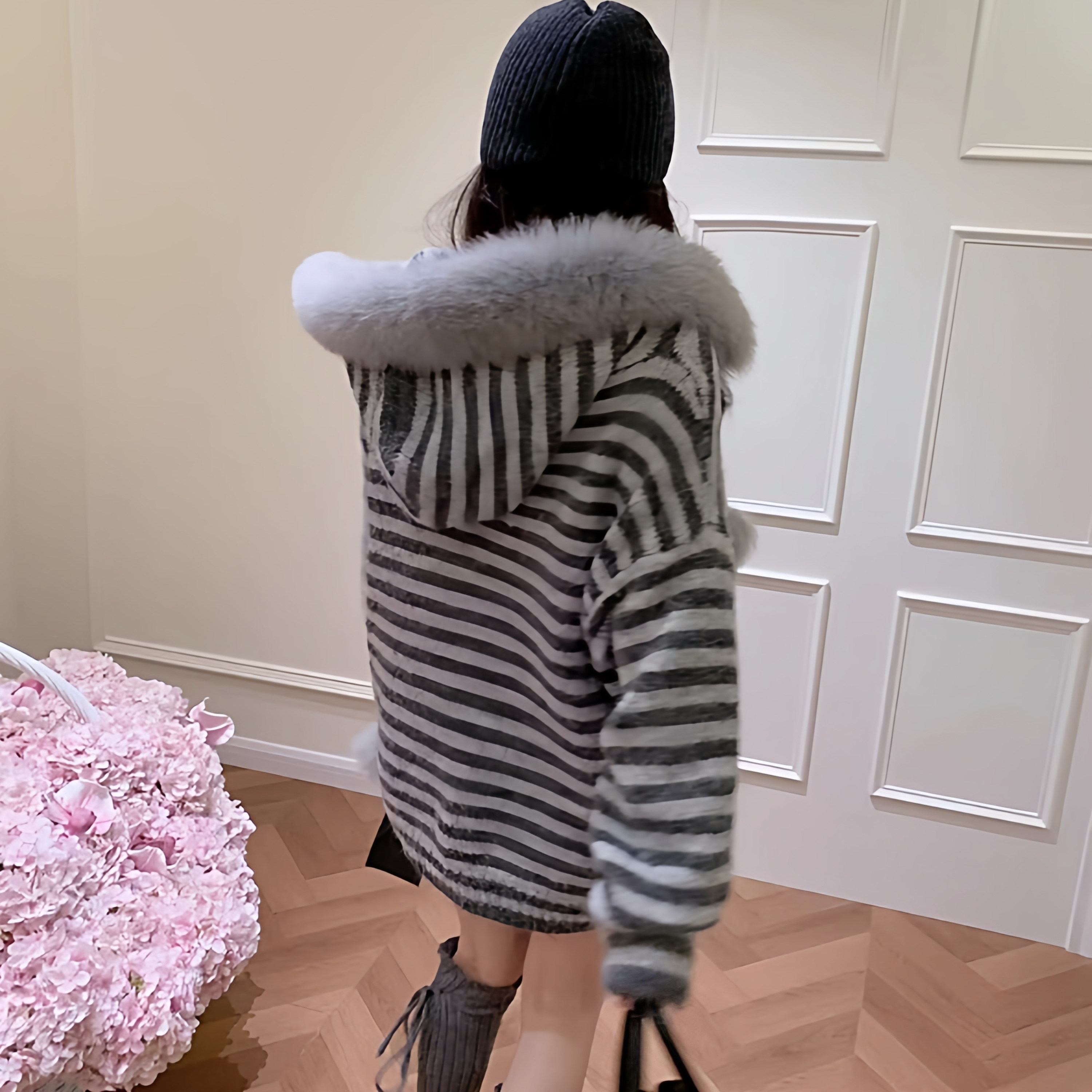 慵懒高级感灰色条纹连帽毛衣外套女秋冬中长款大毛领针织开衫加厚