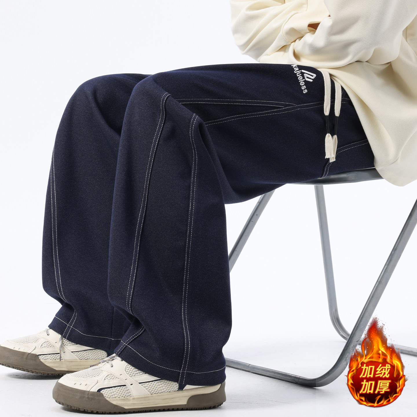 秋冬季新款牛仔裤子男孩青少年初中高中学生加绒加厚直筒休闲长裤