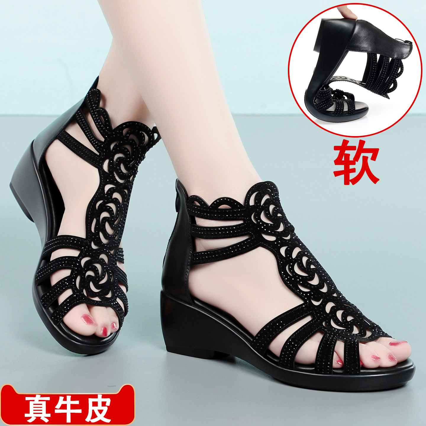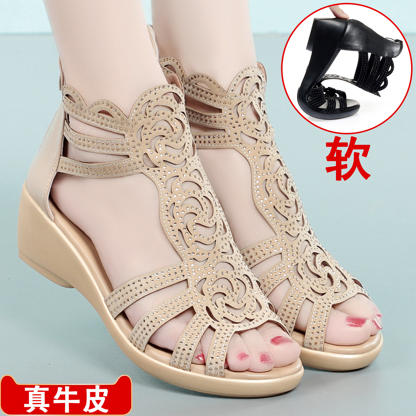 女士凉鞋夏季厚底坡跟女鞋软底不累脚中跟真皮罗马鞋女款2026新款