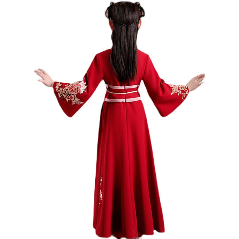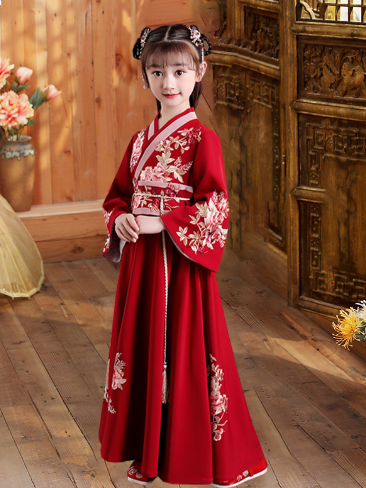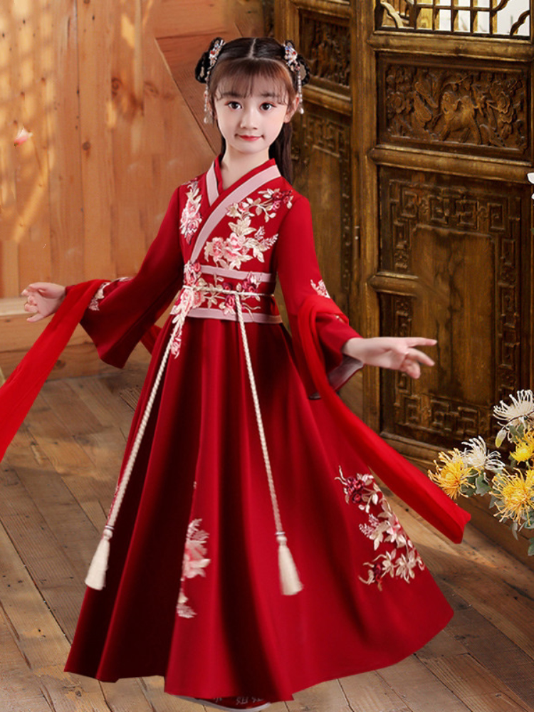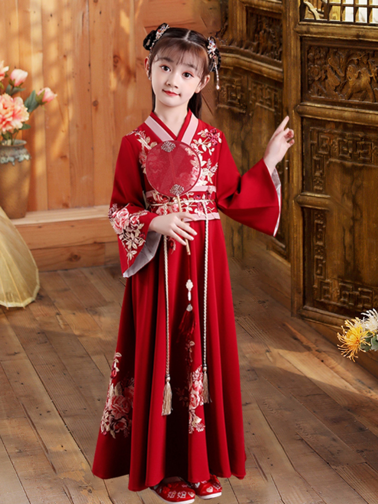 女童汉服礼服新款春秋中国风唐装儿童古装襦裙超仙红色长袖连衣裙