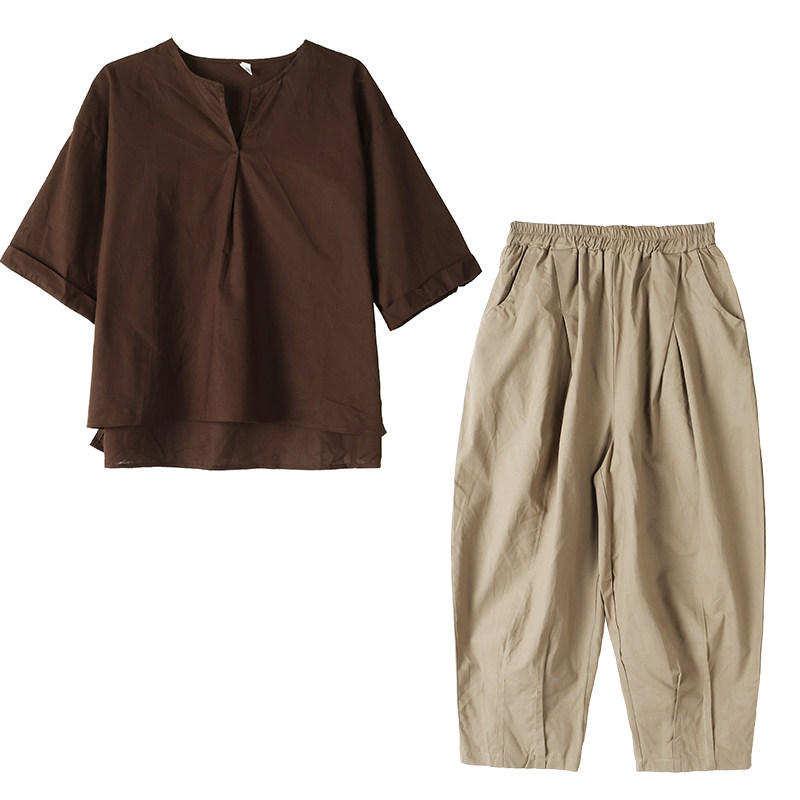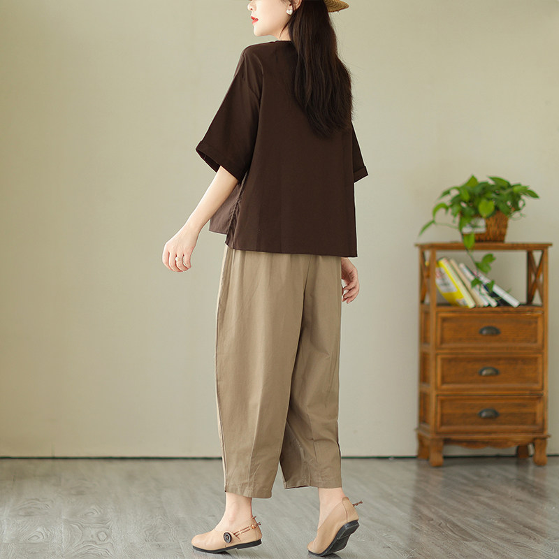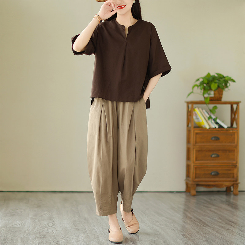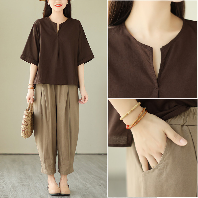 休闲棉麻套装女夏季2026年新款洋气妈妈复古宽松大码灯笼裤两件套