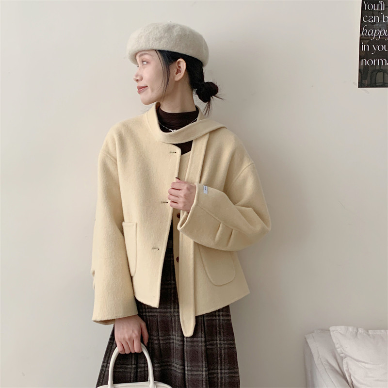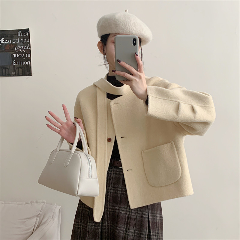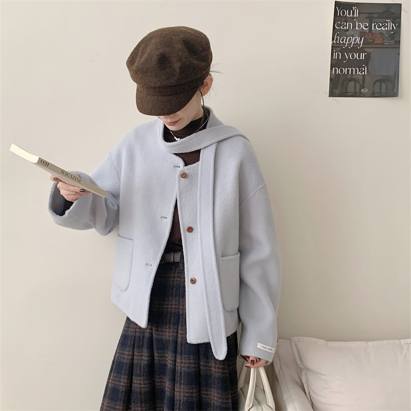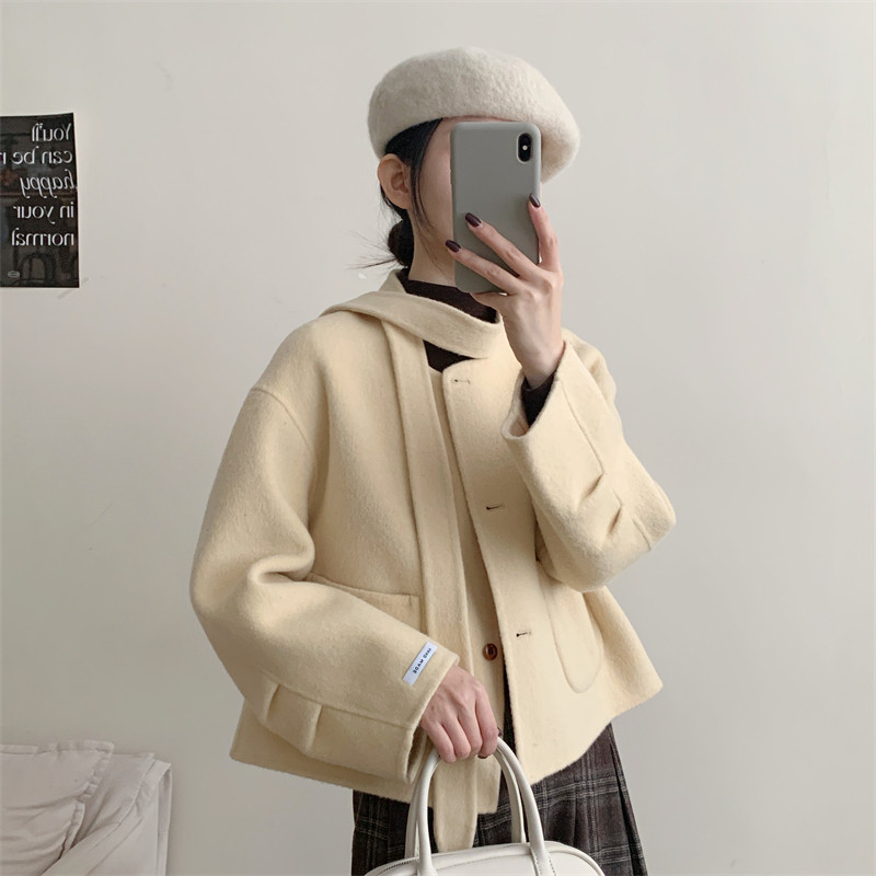 初吾家25秋冬季新款韩系领口系带宽松显瘦小个子双面呢短款外套女