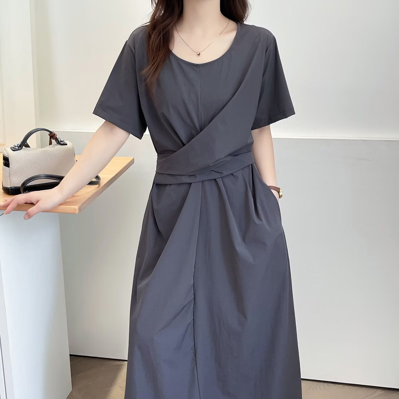 巨显瘦遮肉大码连衣裙高级感2025夏季新款胖妹妹系带收腰短袖长裙