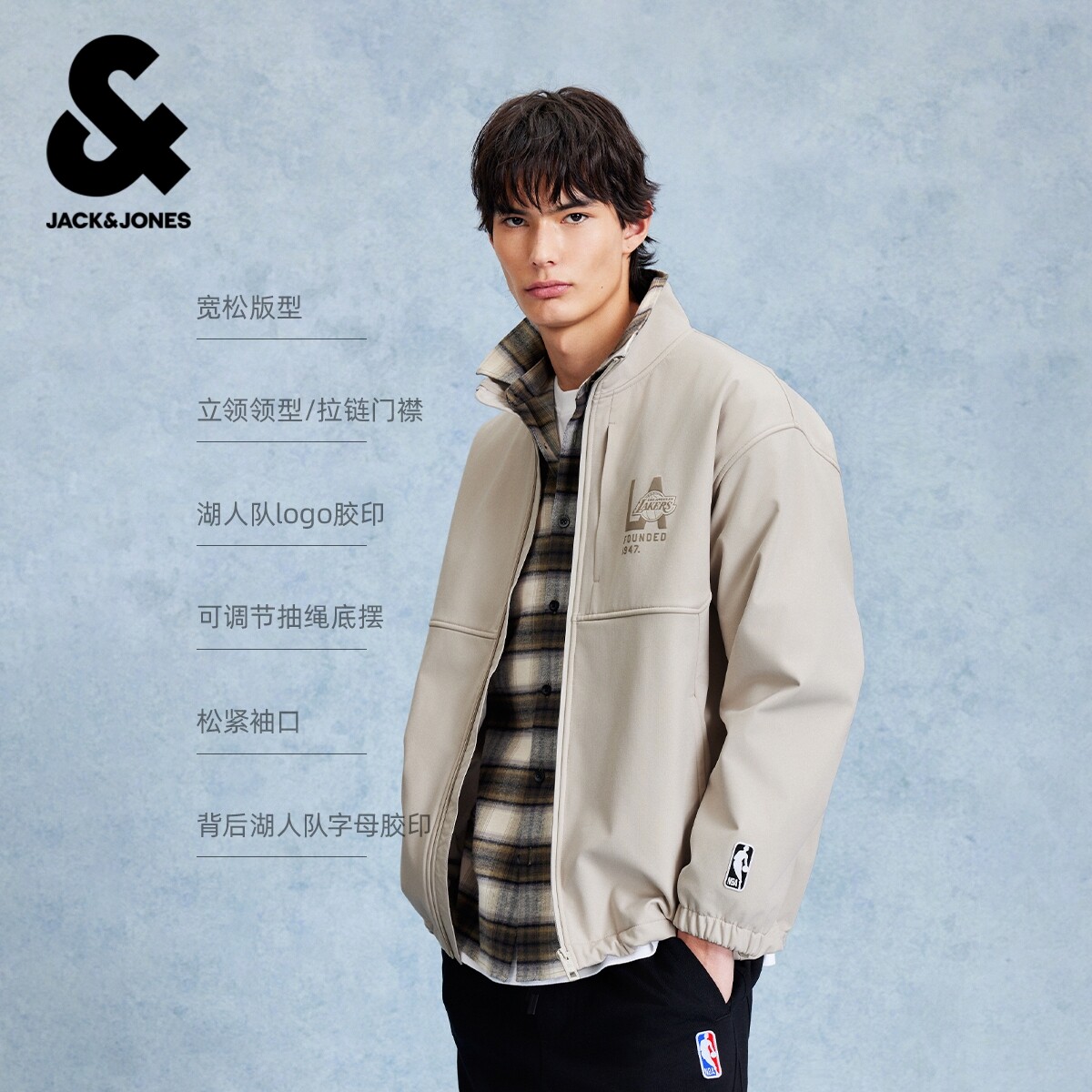 绫致杰克琼斯春季男外套棉服棉衣时尚百搭潮宽松立领洛杉矶湖人队