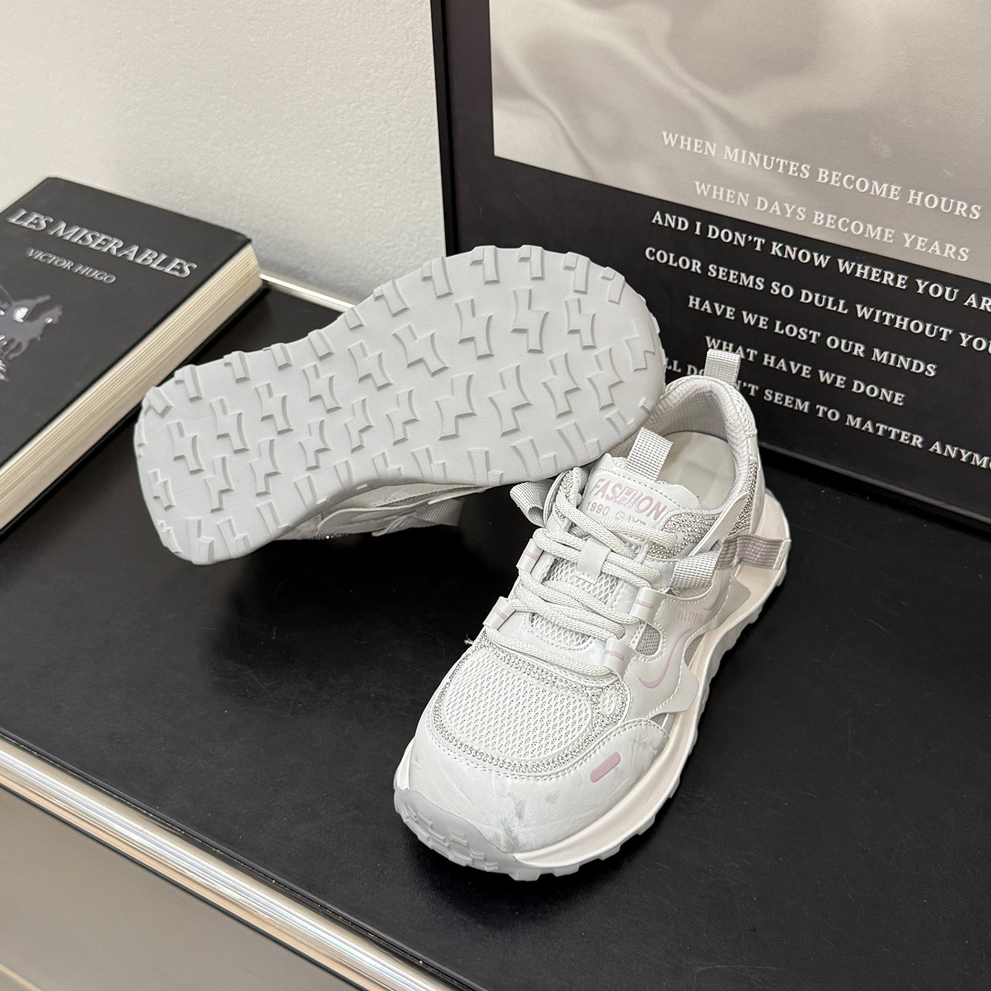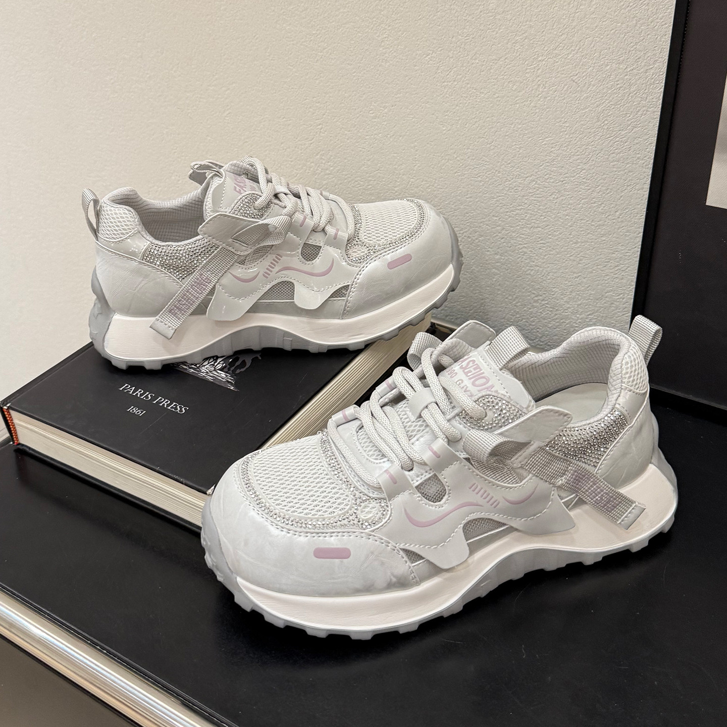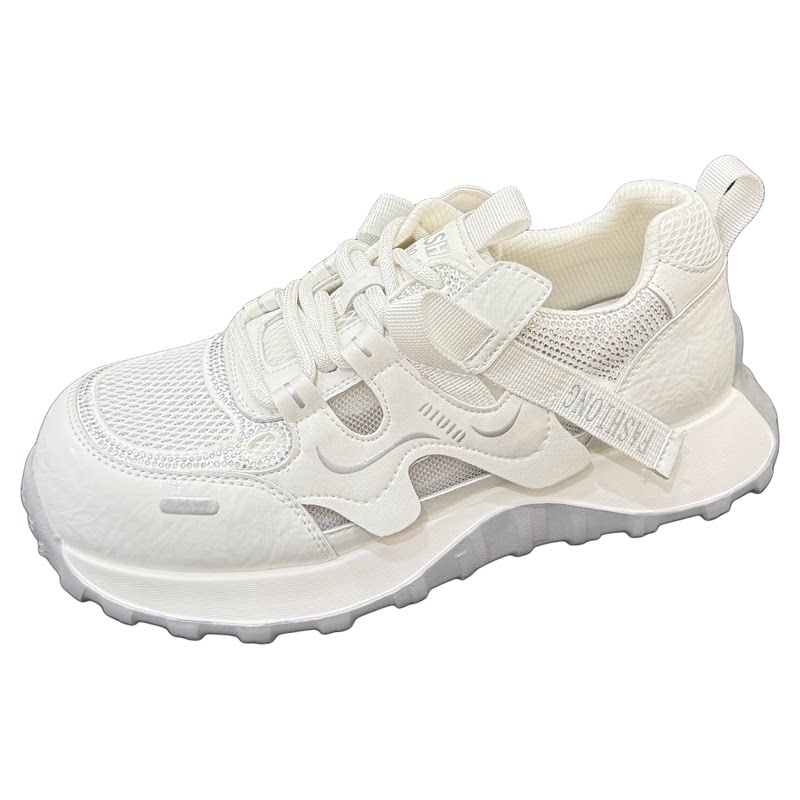 夏款镂空水钻网面内增高老爹鞋女2026新款透气女鞋系带休闲运动鞋