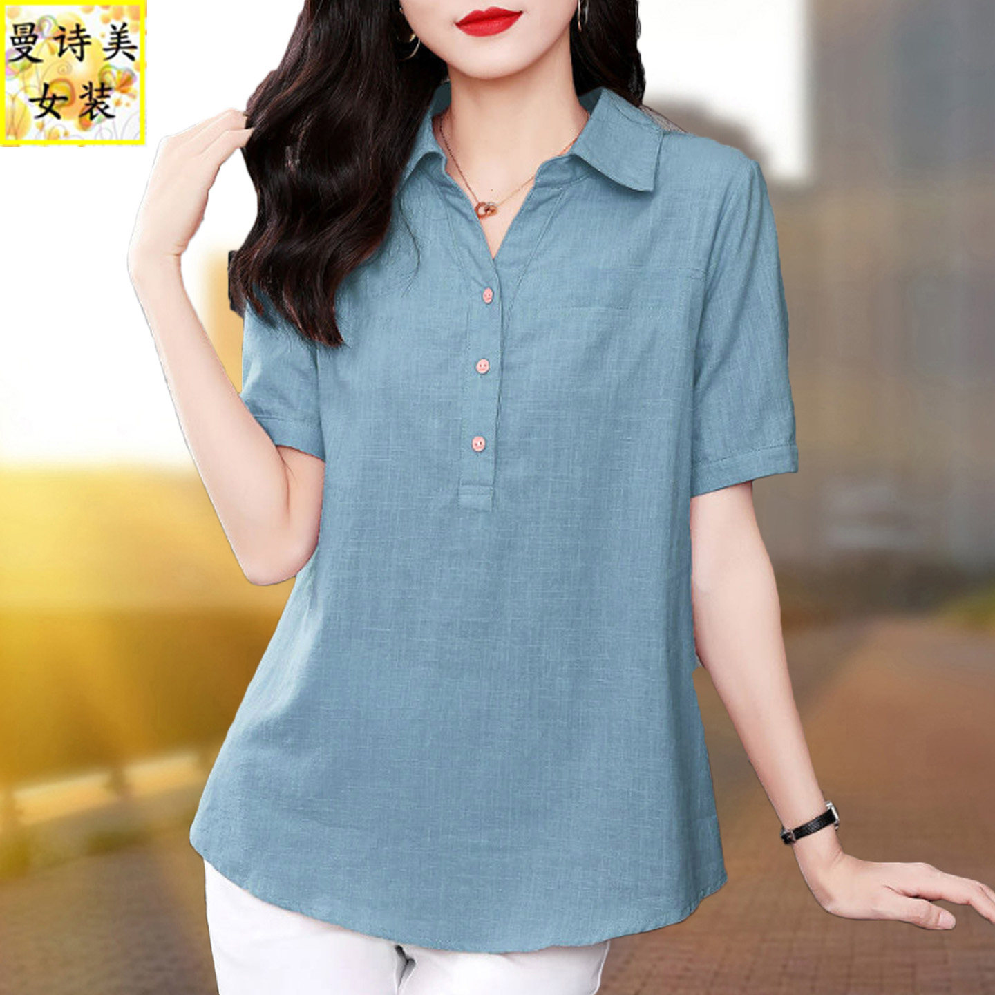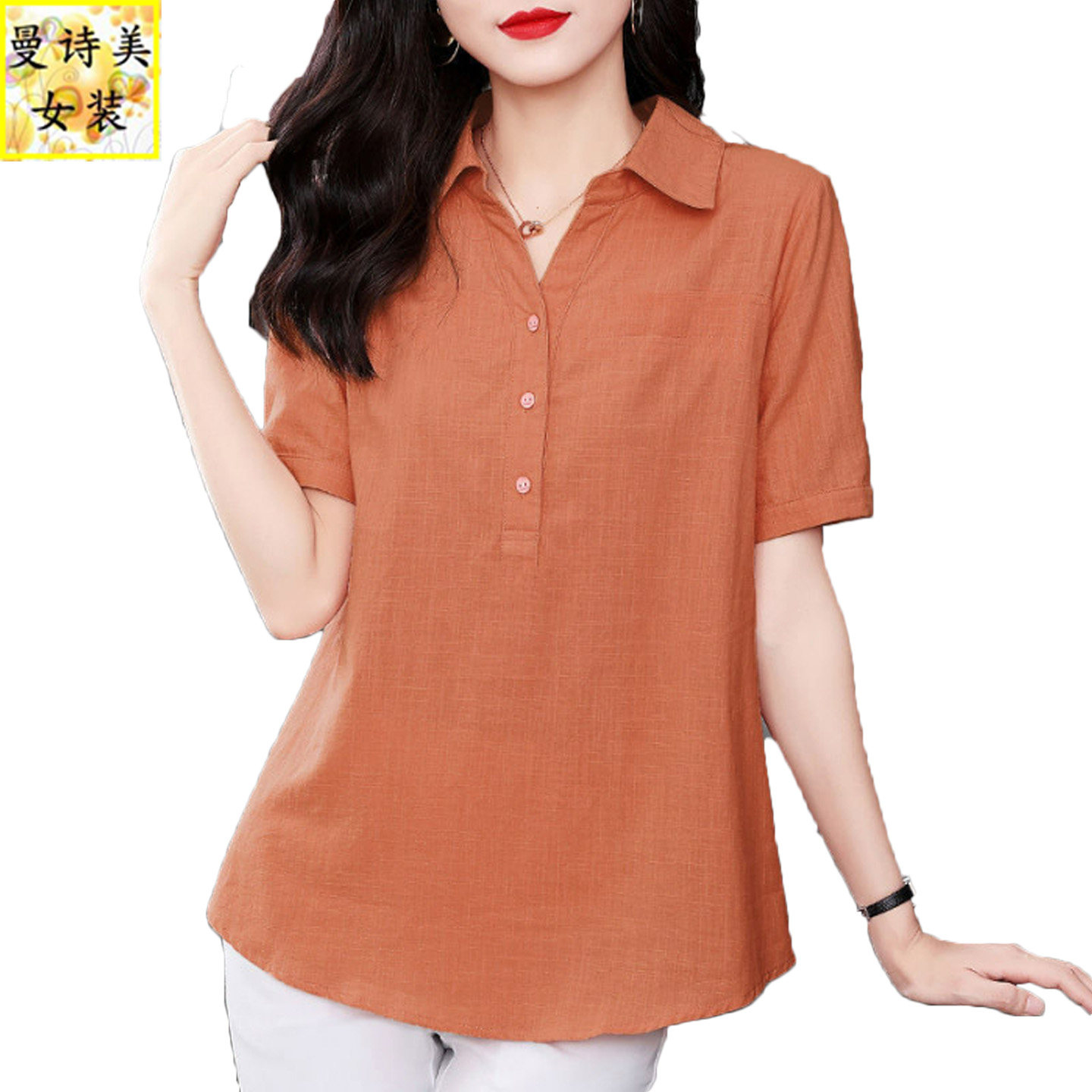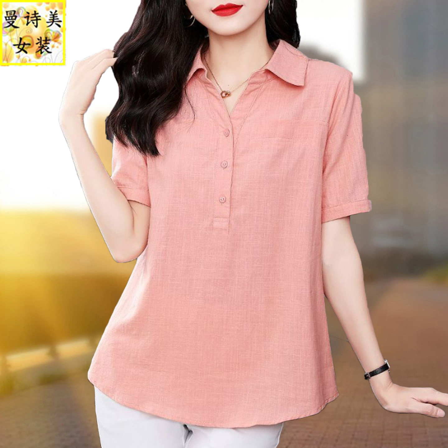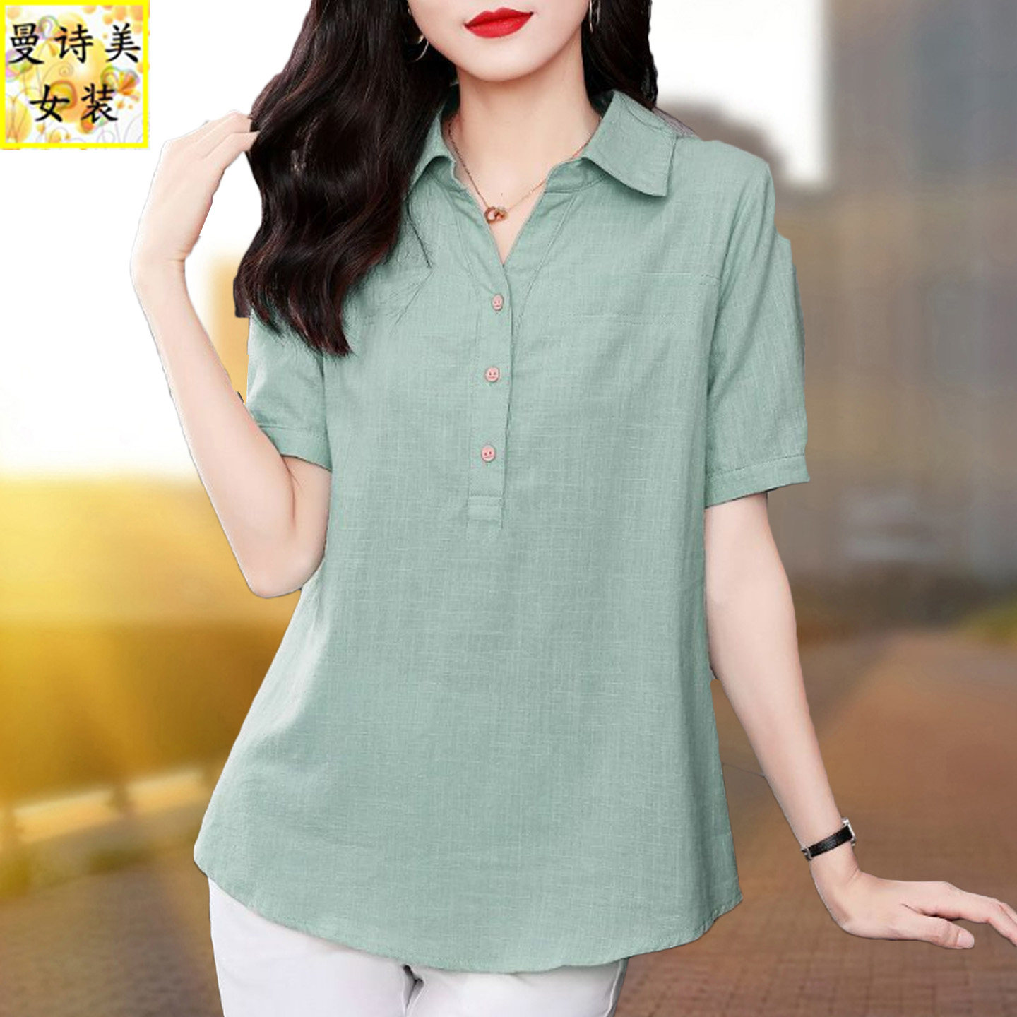 女士纯棉短袖套头衬衫2026夏季新款宽松大码中年妈妈透气全棉衬衣