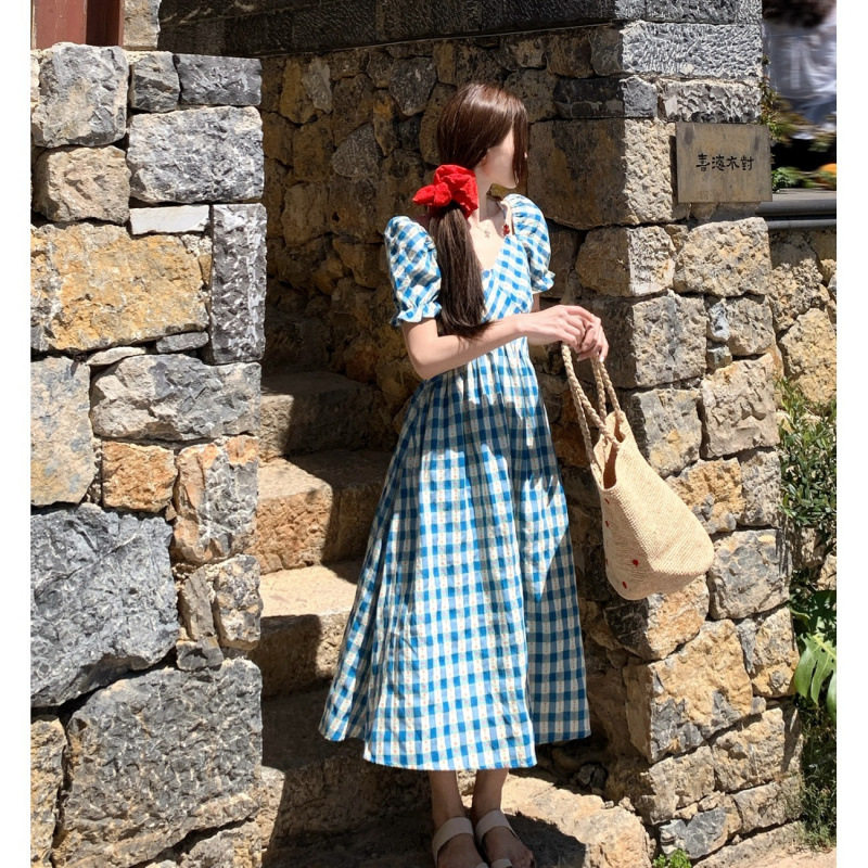 大码海边度假连衣裙女夏季泡泡袖复古裙子胖mm遮肚显瘦格子a字裙