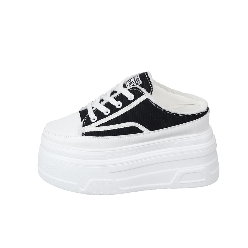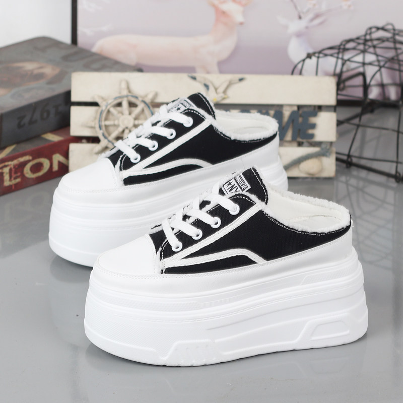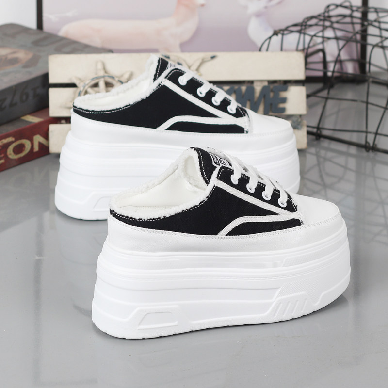 2026春帆布半拖鞋小白鞋女厚底内增高10-12CM小个子无后跟懒人鞋