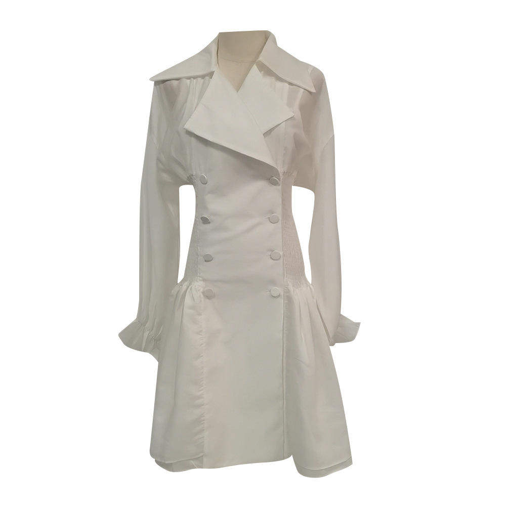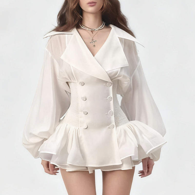 法式甜美风短款连衣裙2026大翻领纽扣泡泡袖收腰修身款蓬蓬裙单件