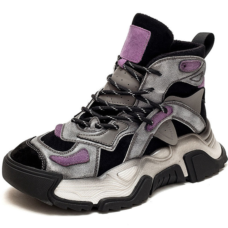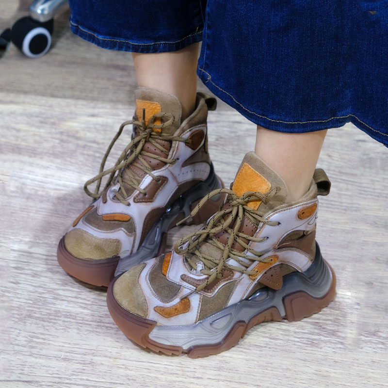 小婉高端品质头层牛皮高帮老爹鞋女秋冬松糕厚底系带拼色复古短靴