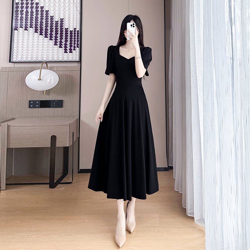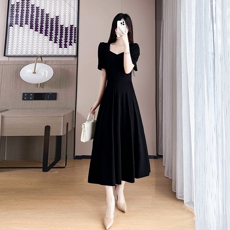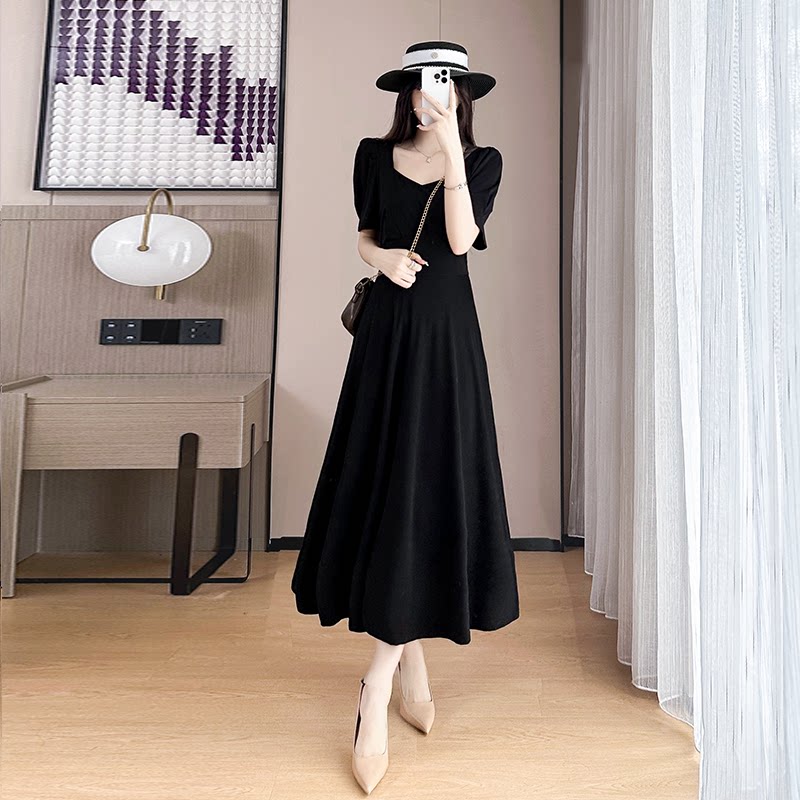 法式赫本风黑色长裙女2026夏季新款气质收腰显瘦方领高级感连衣裙