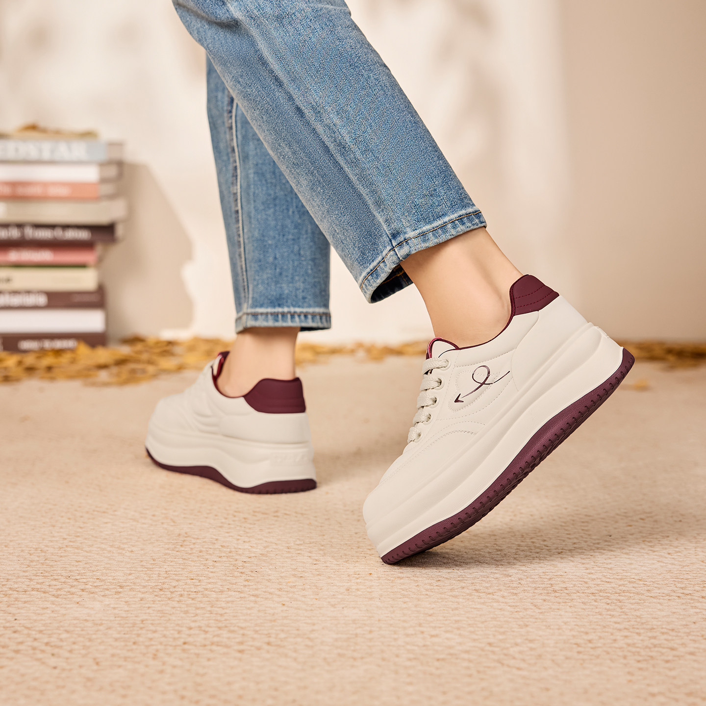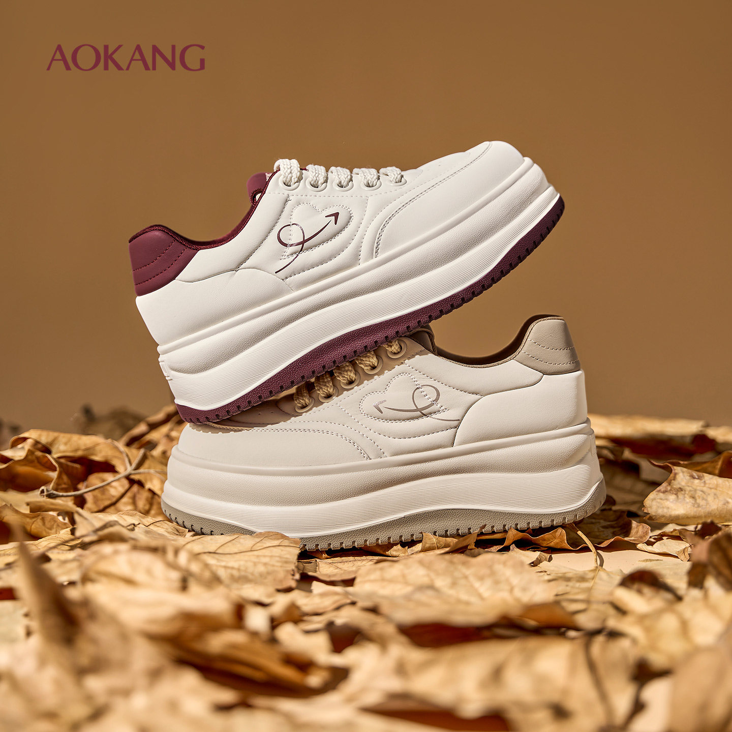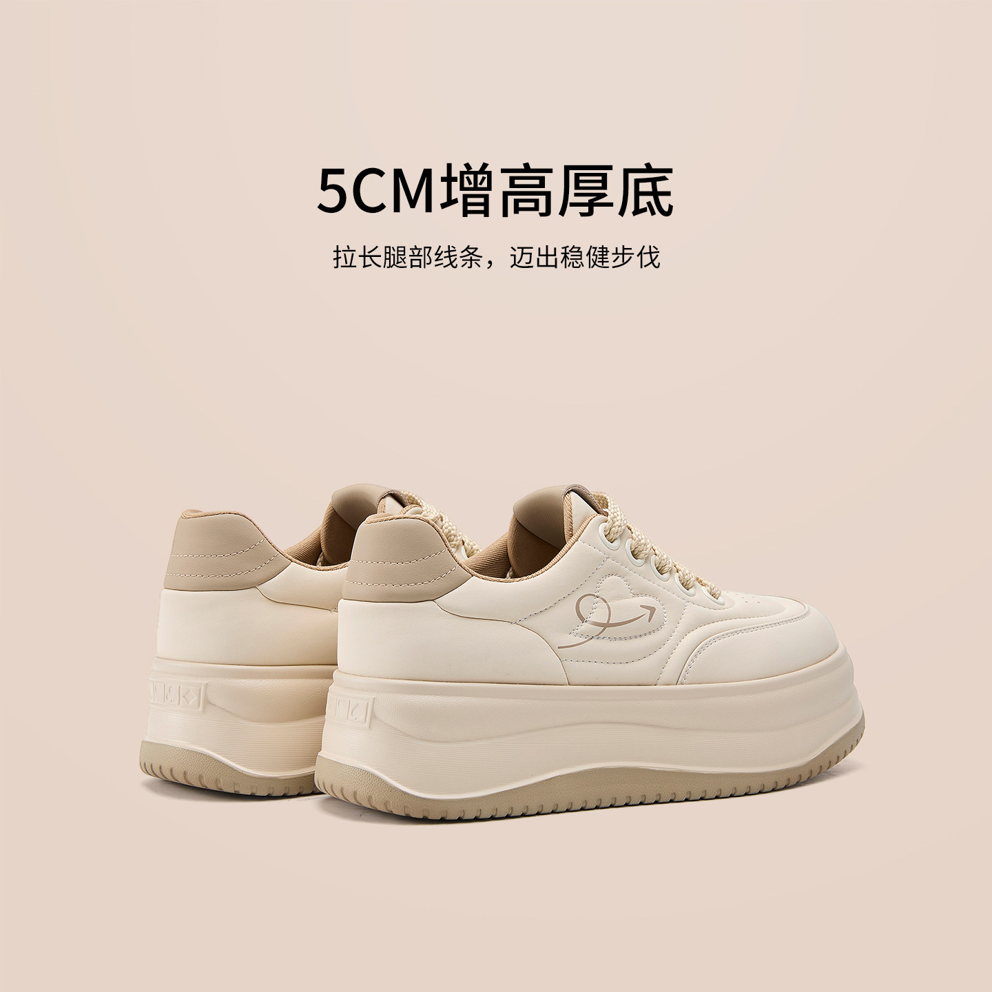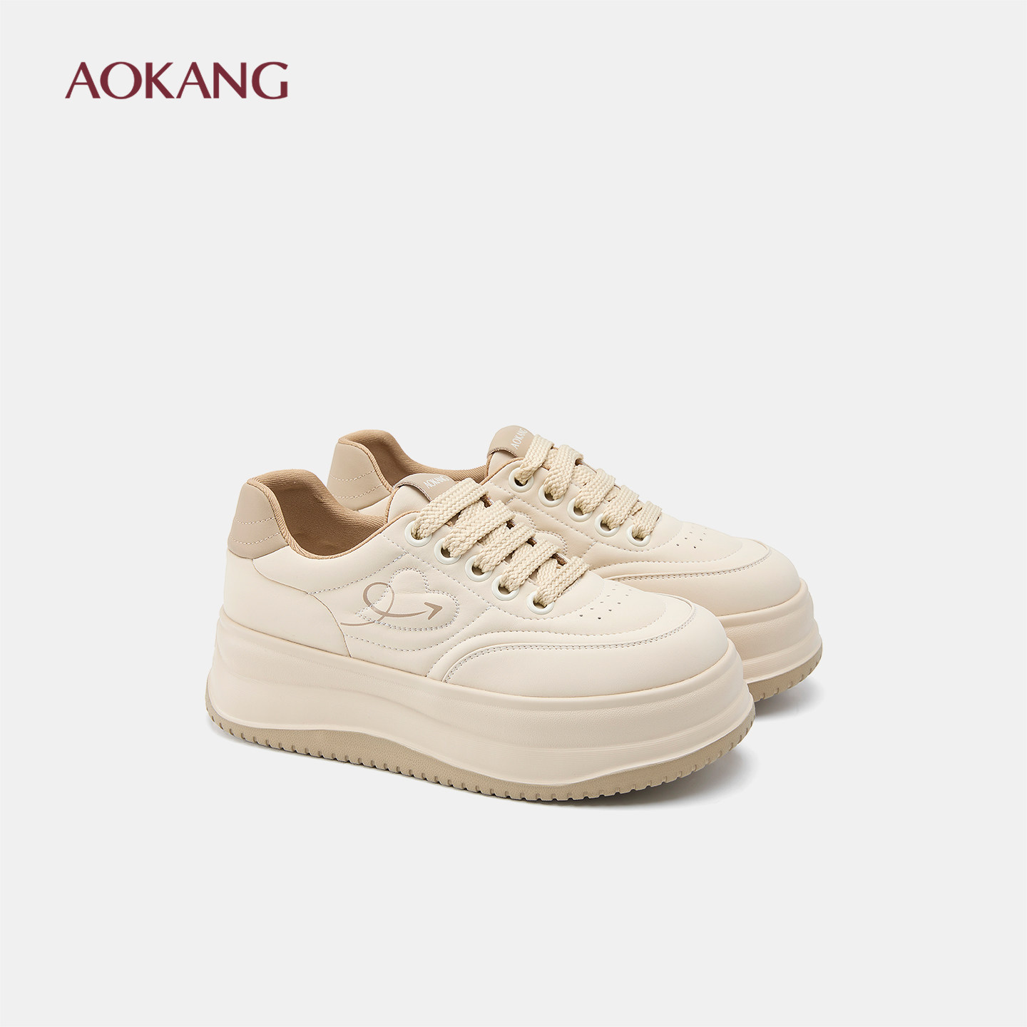 奥康 女鞋春秋板鞋圆头系带美萌面包鞋增高休闲鞋门店发货