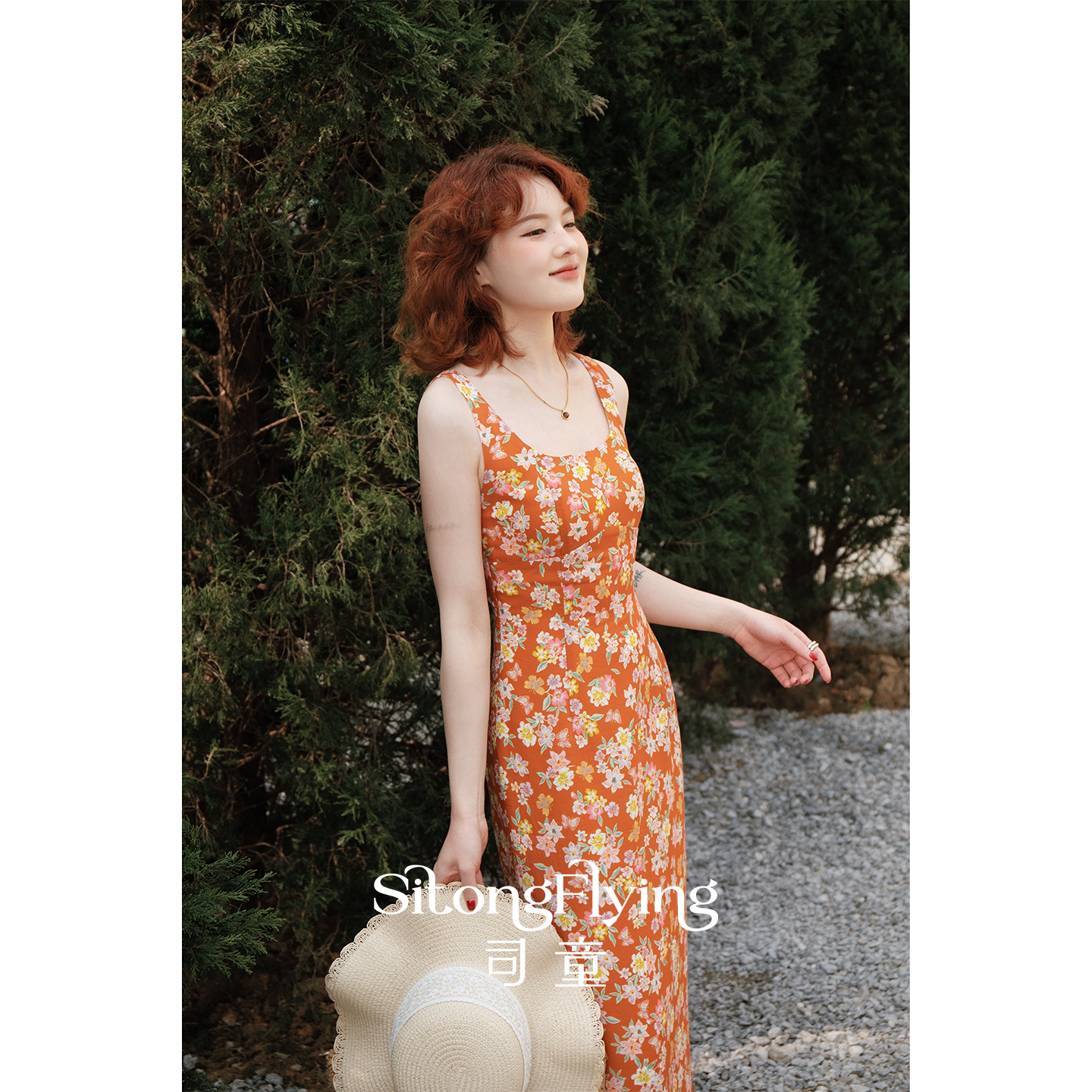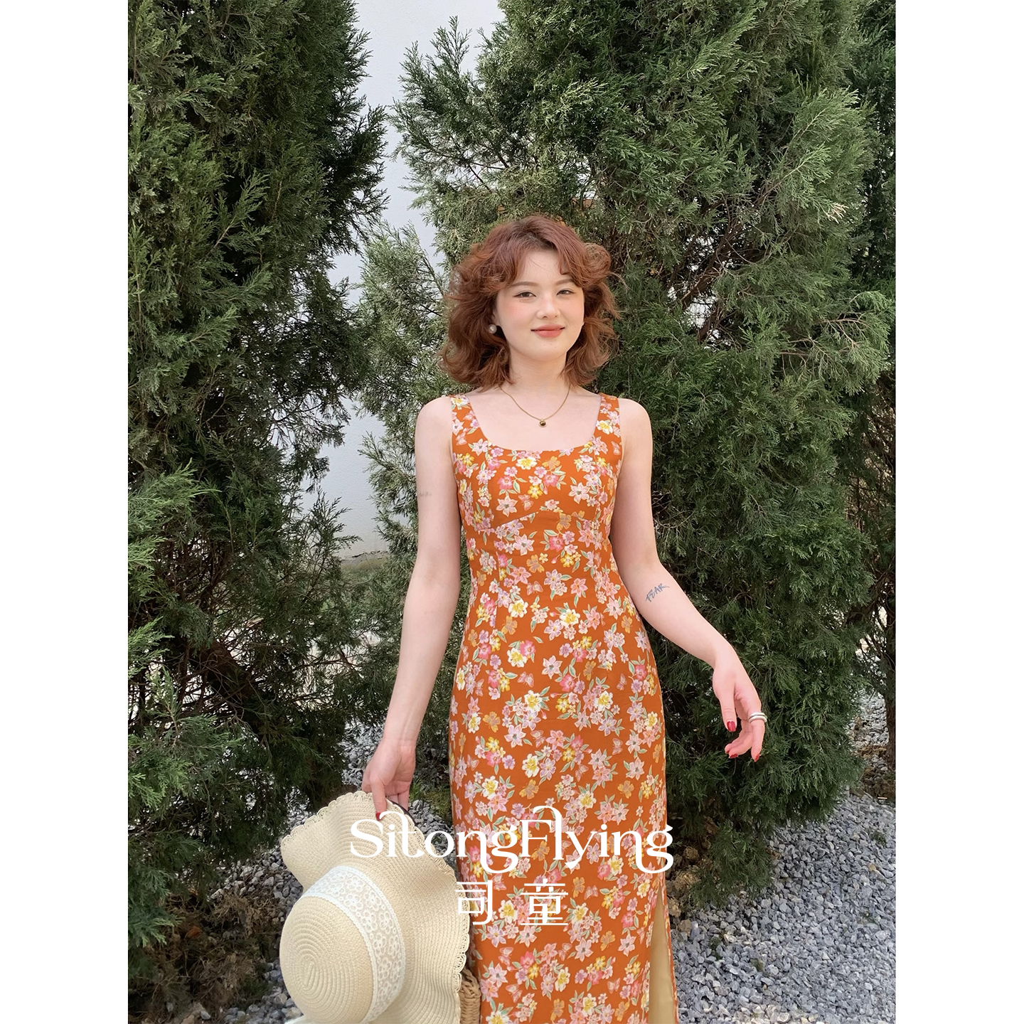 司童 橙色海岸小碎花吊带连衣裙夏季新款方领修身中长裙女裙子