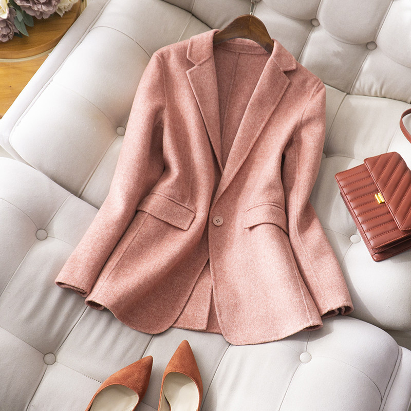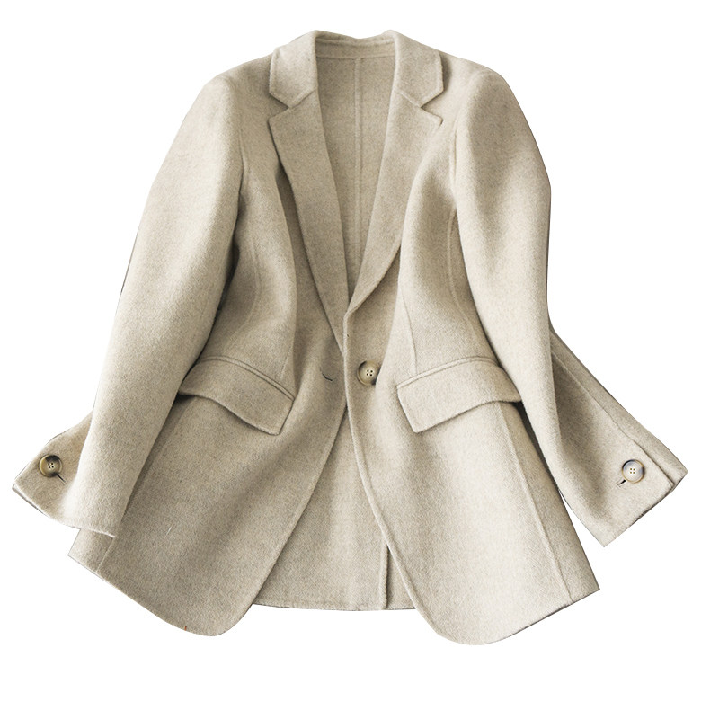 米色毛呢西装外套女秋冬小个子短款百搭高端人字纹双面呢羊绒大衣