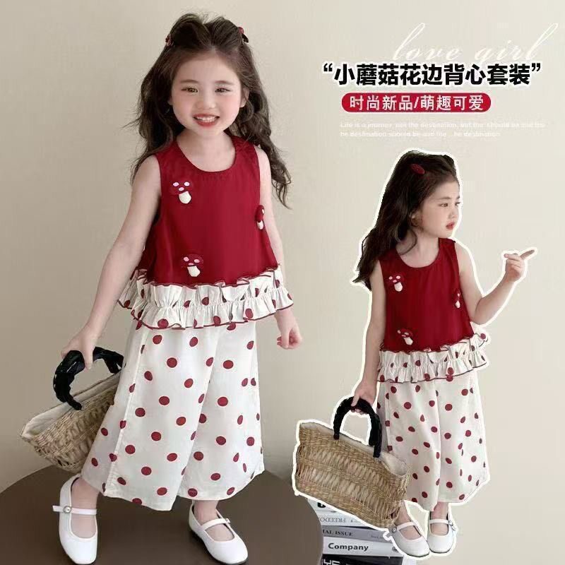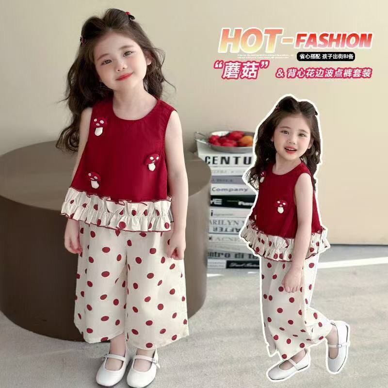 女童夏季套装2026新款女宝宝时髦纯棉蘑菇背心波点阔腿裤两件套