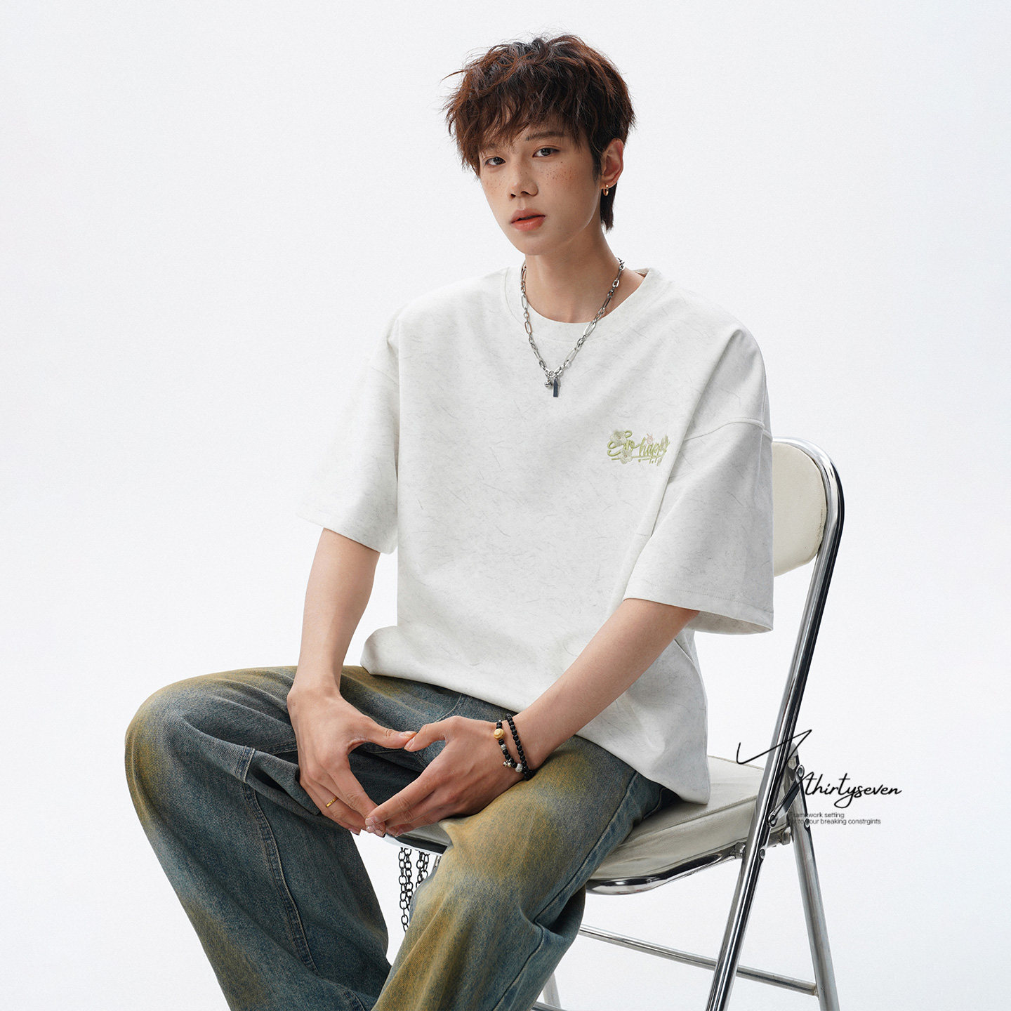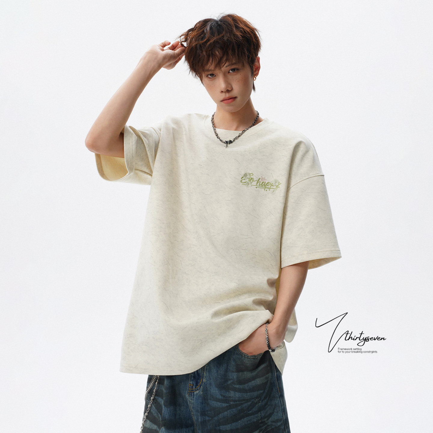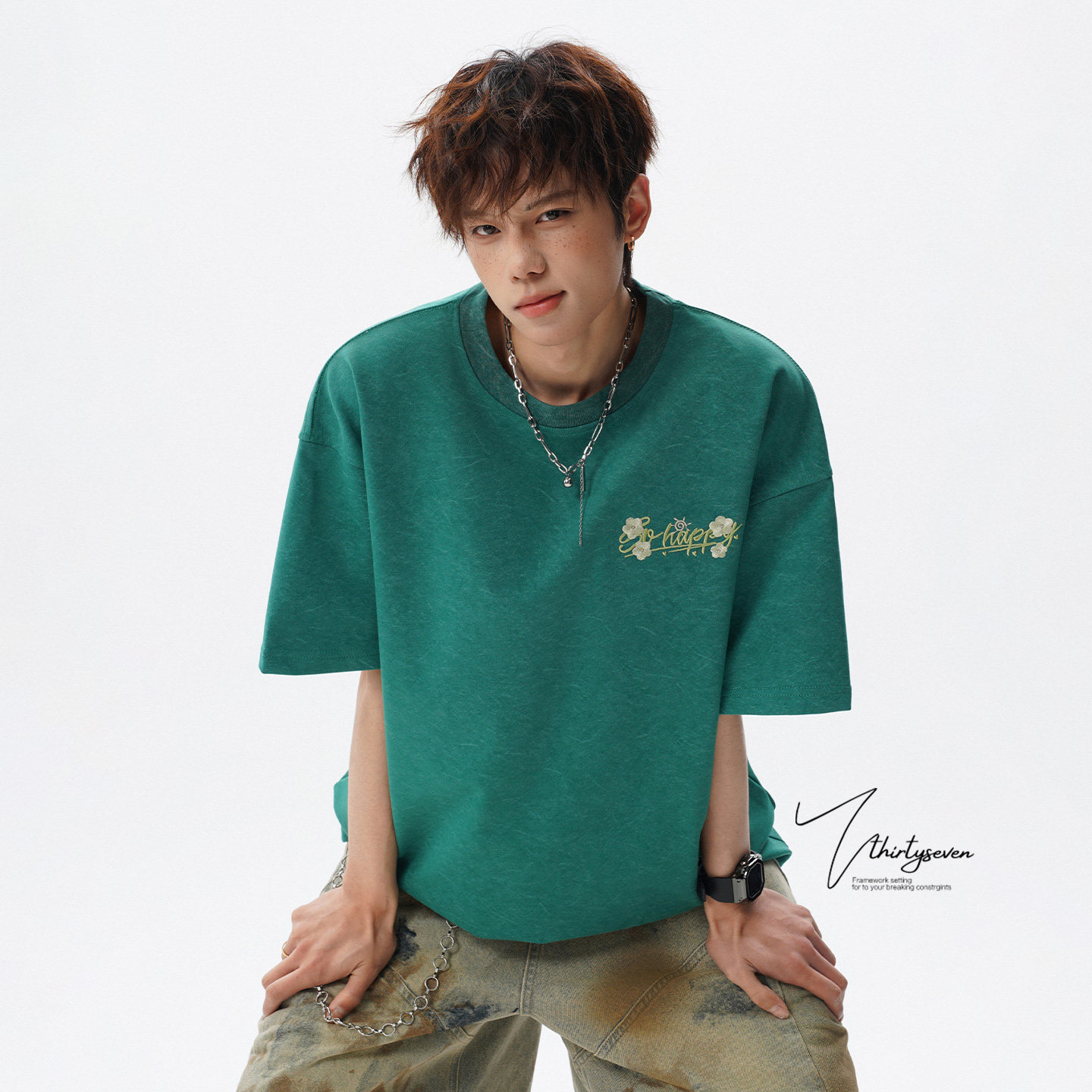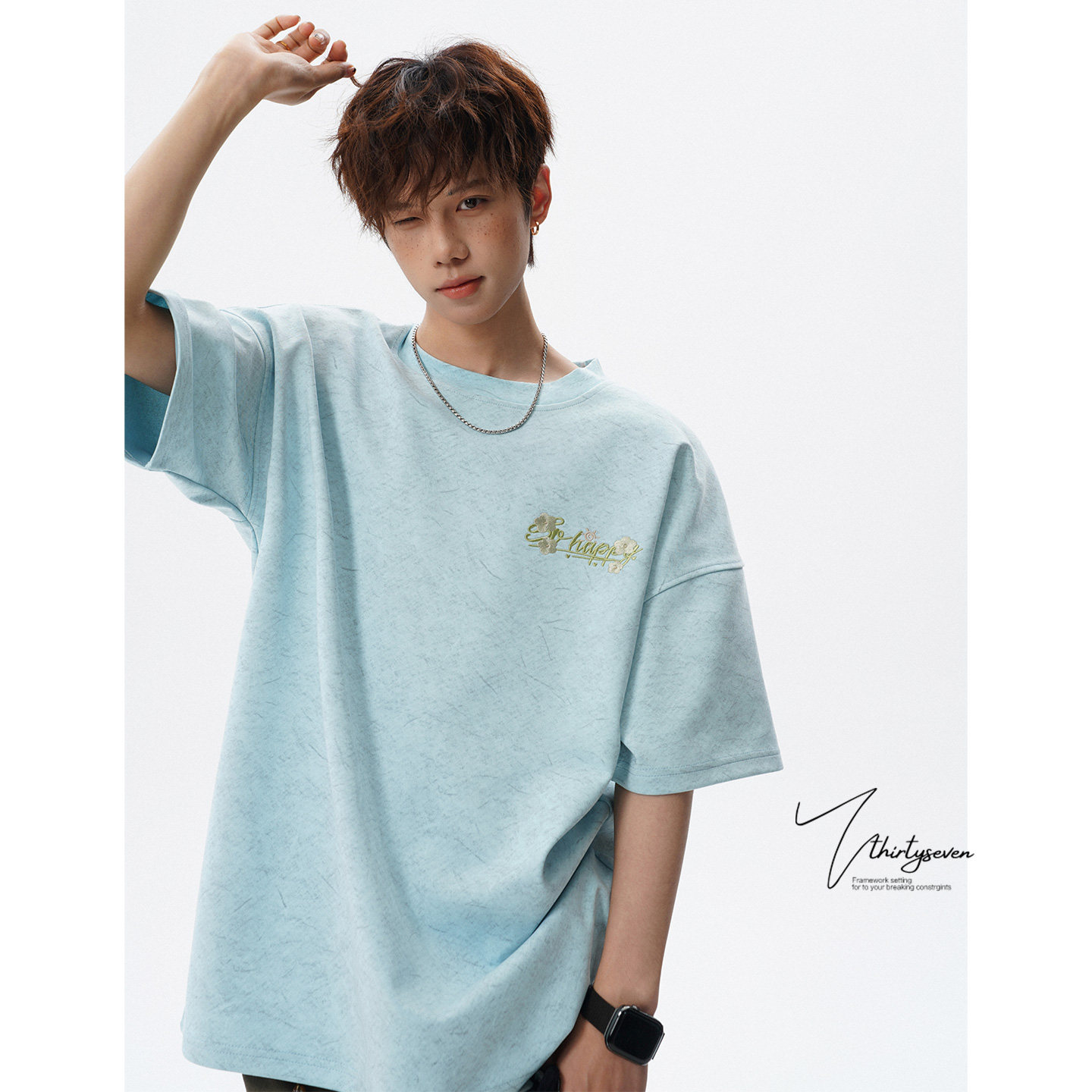 V37刺绣短袖T恤男生夏季2026新款美式重磅上衣青少年潮牌宽松半袖