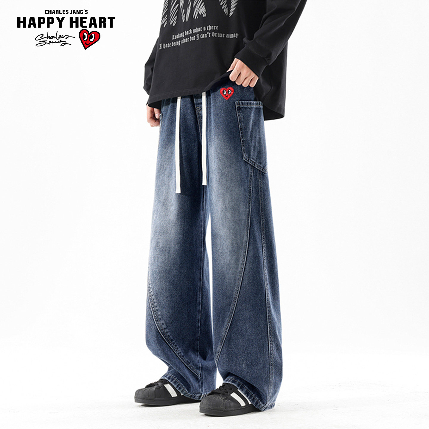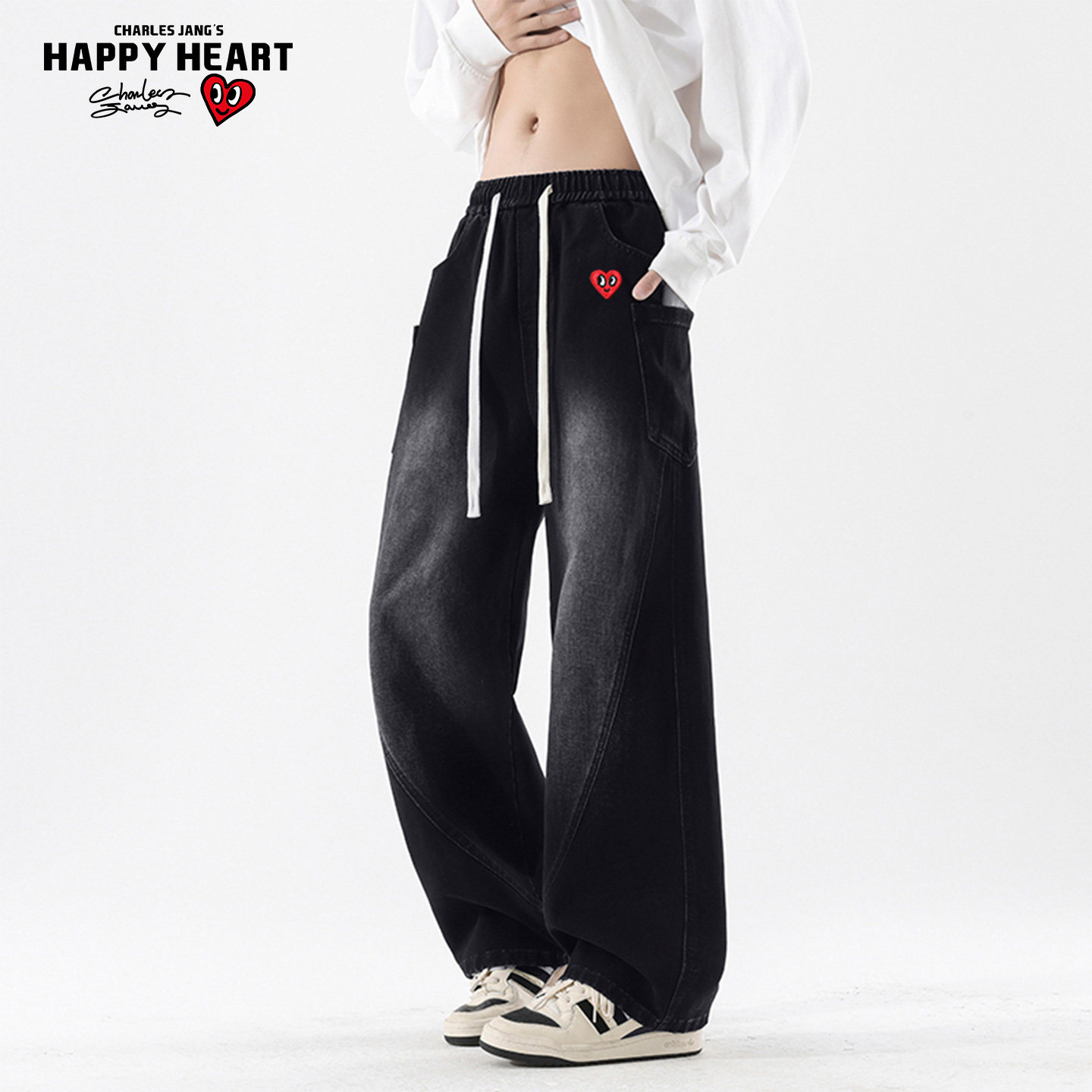 查尔斯桃心爱心刺绣水洗牛仔裤男女款夏上新宽松百搭直筒休闲裤子
