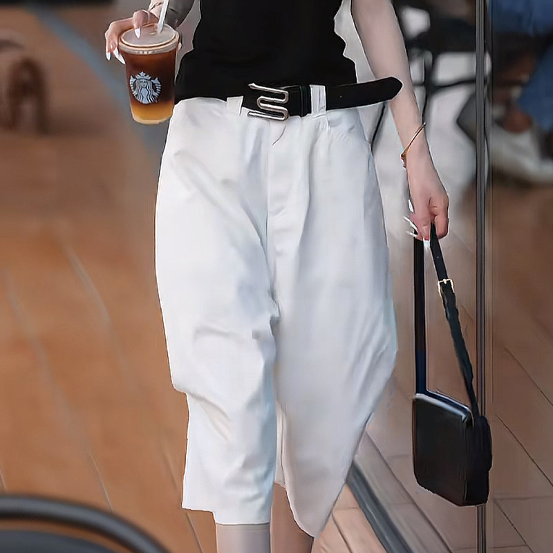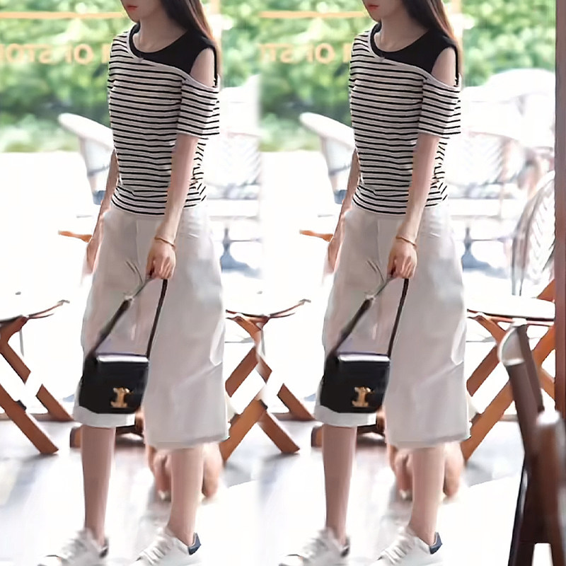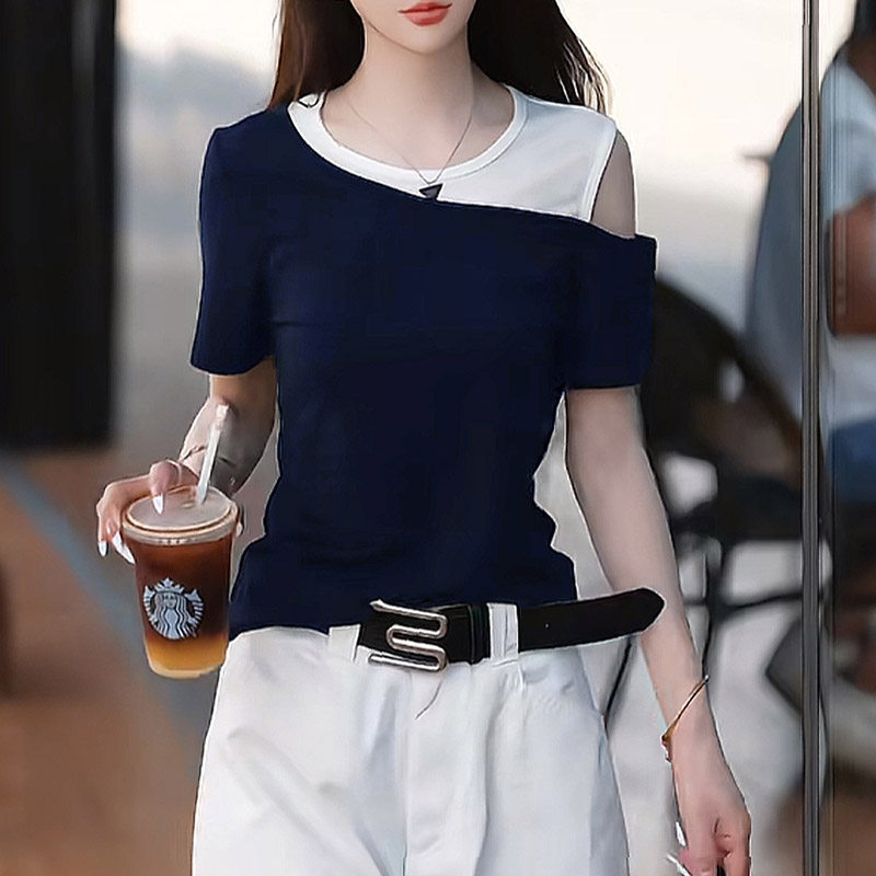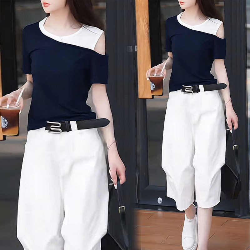 巨好看的两件套夏装女2026新款拼色露肩短袖上衣六分休闲裤子套装