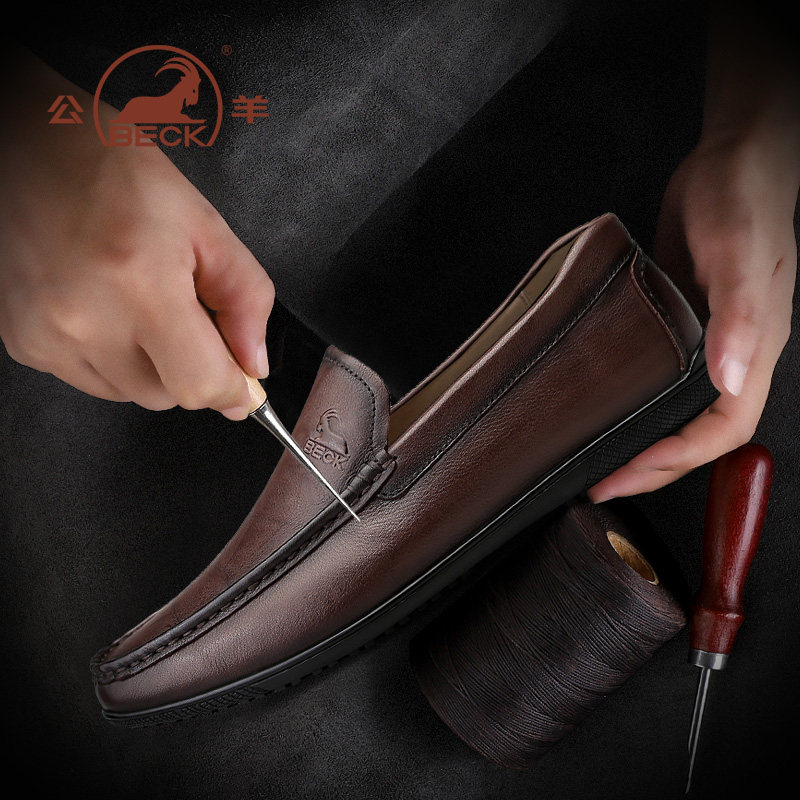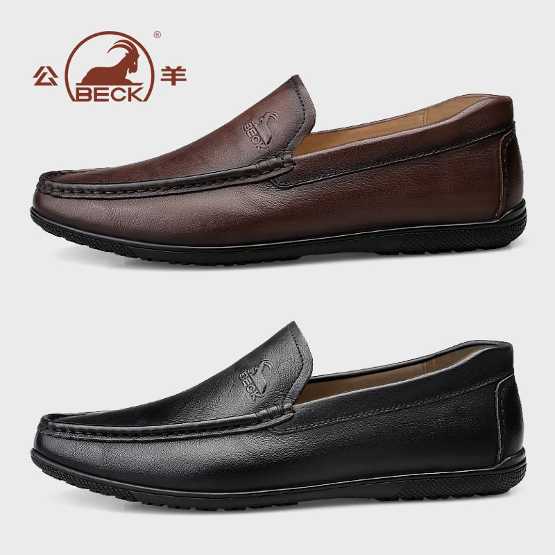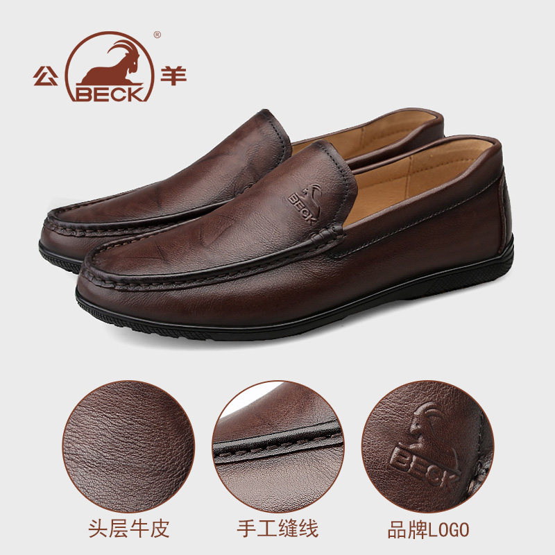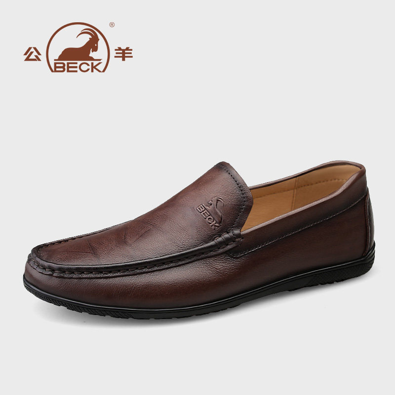 公羊豆豆鞋男款真皮男士休闲皮鞋男棕色头层牛皮套脚一脚蹬男鞋子