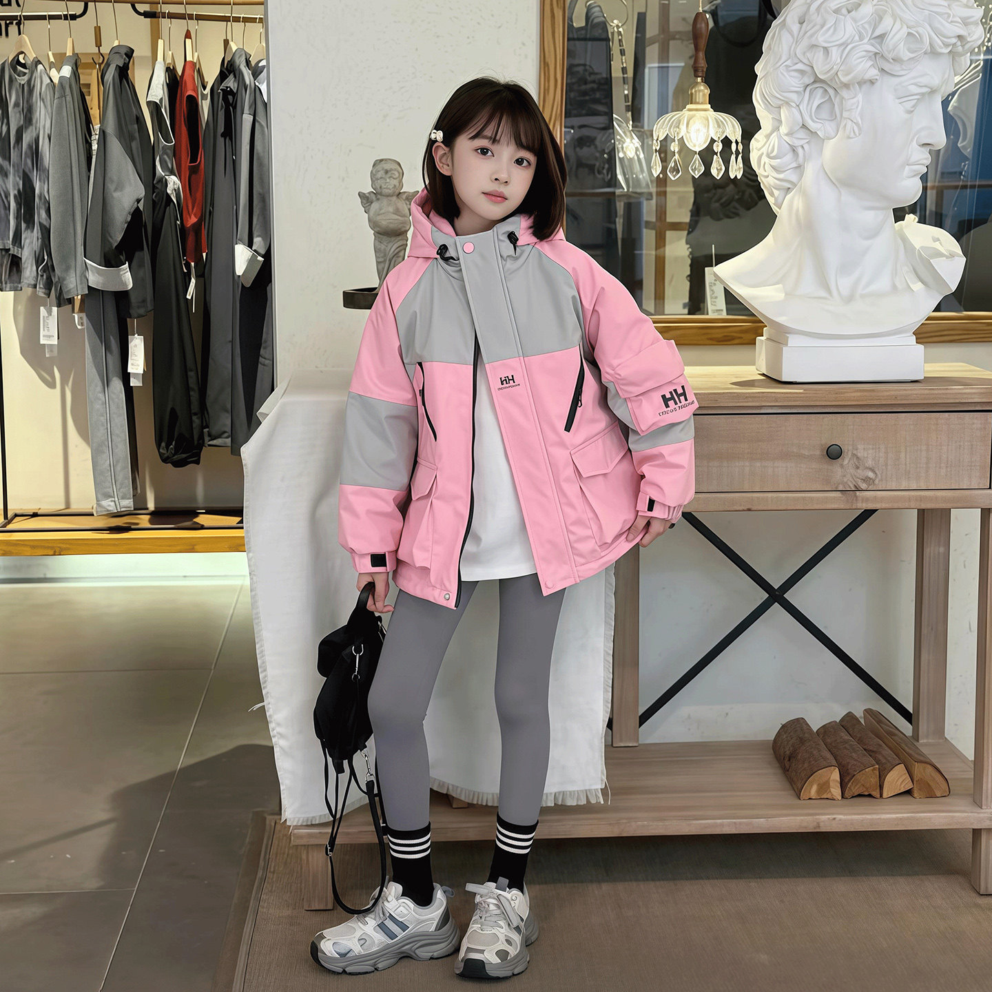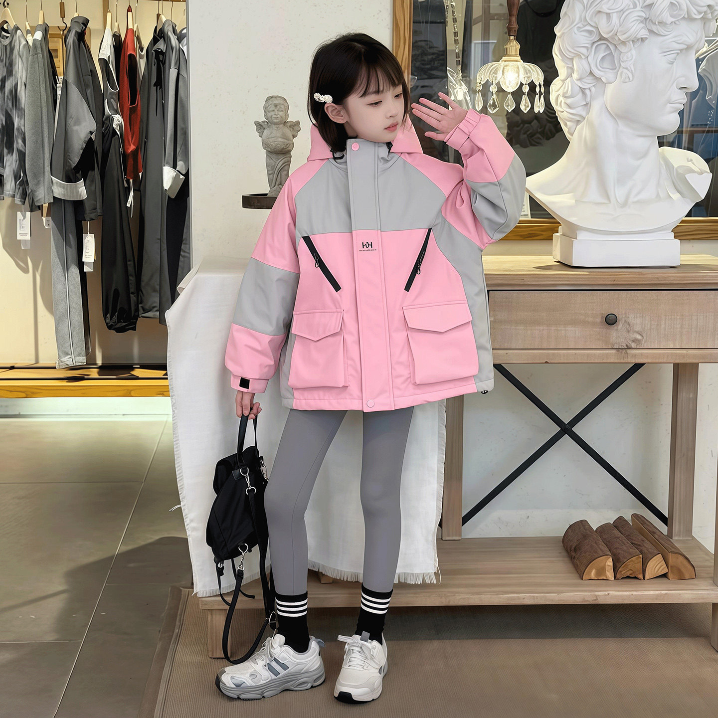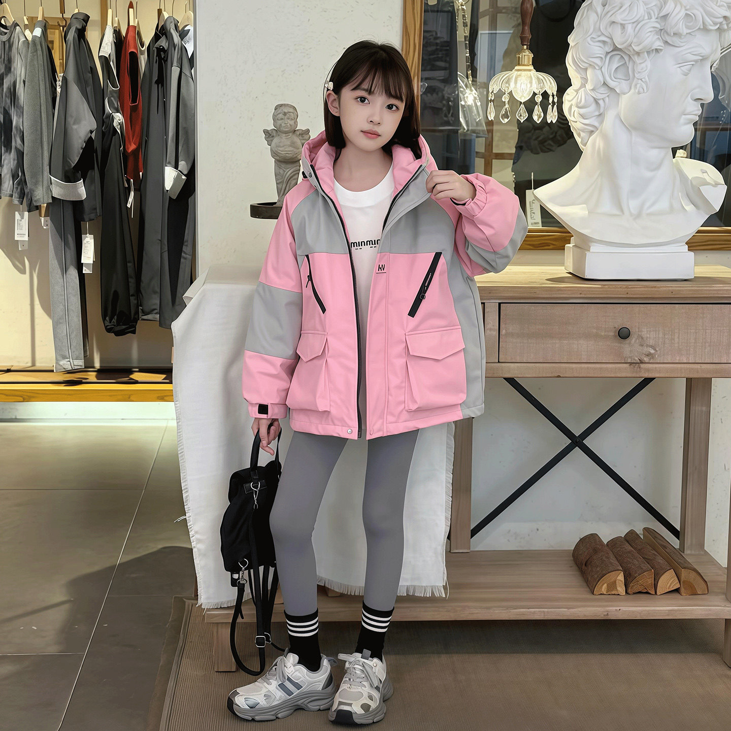 女童秋冬二棉拼色连帽冲锋衣洋气中大童夹棉加厚防风工装休闲外套