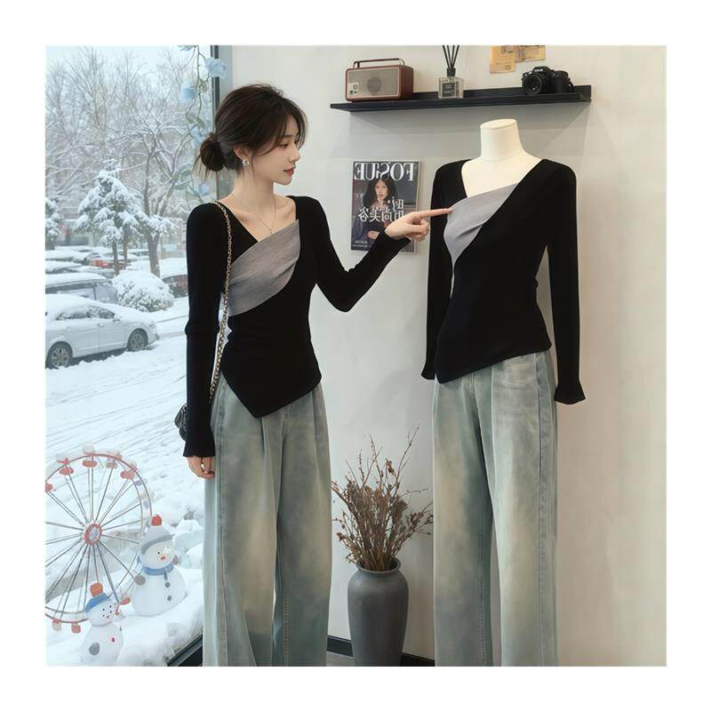 秋冬穿搭黑色不规则修身拼色针织衫毛衣女款2025新款打底内搭上衣