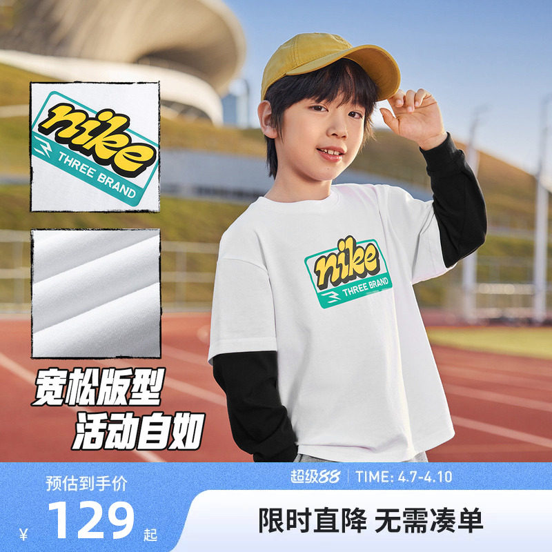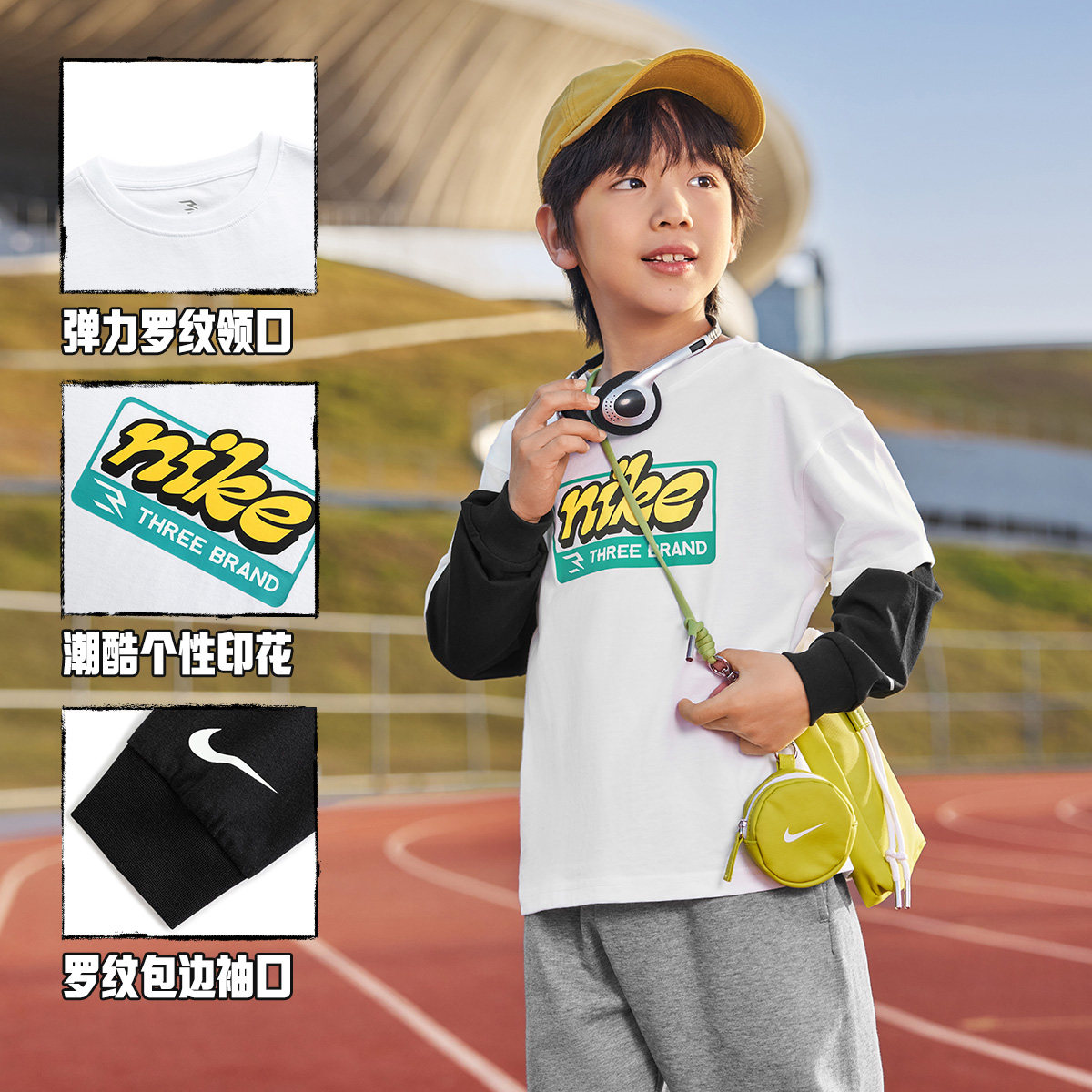 Nike 3brand童装儿童长袖T恤2026新款男童女童假两件柔棉上衣内搭