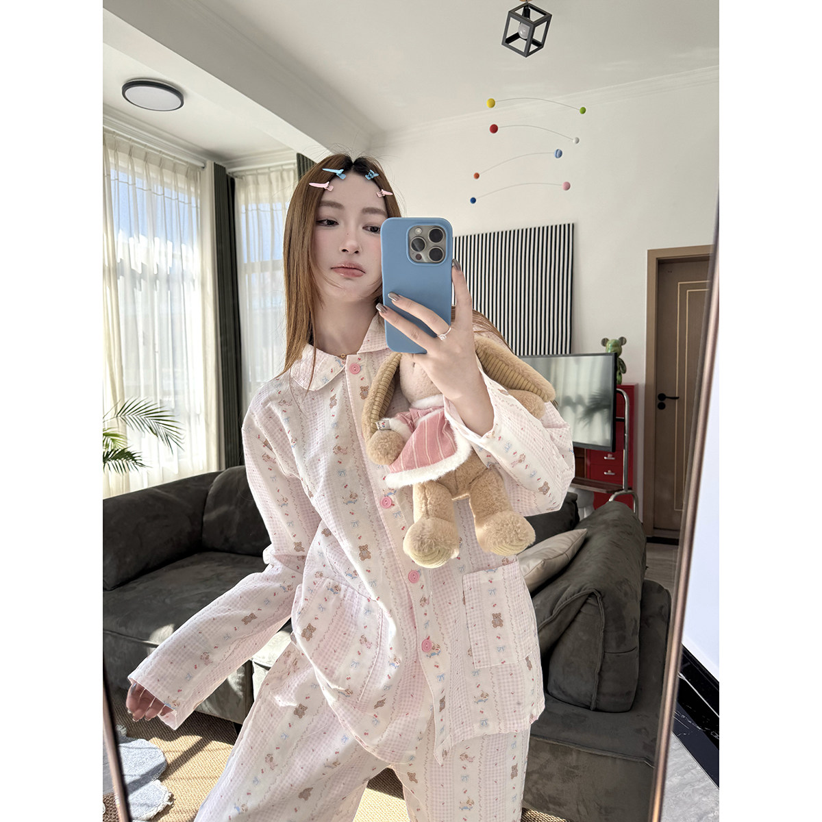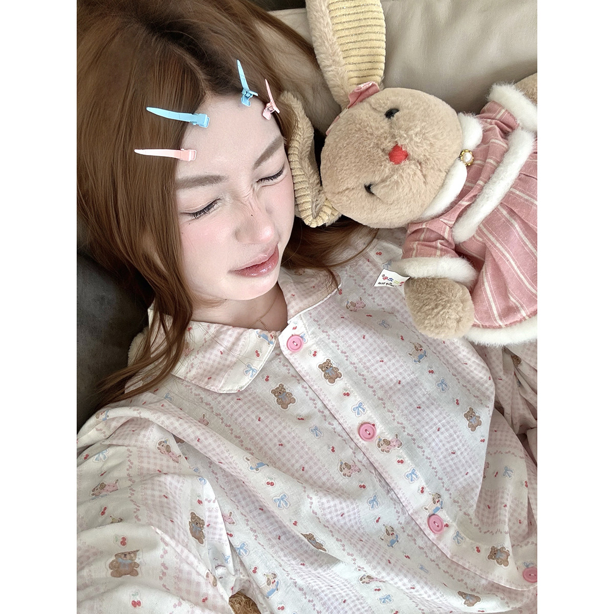 JoyceBra 可爱卡通小熊格纹纯棉睡衣套装女款柔软舒适宽松家居服