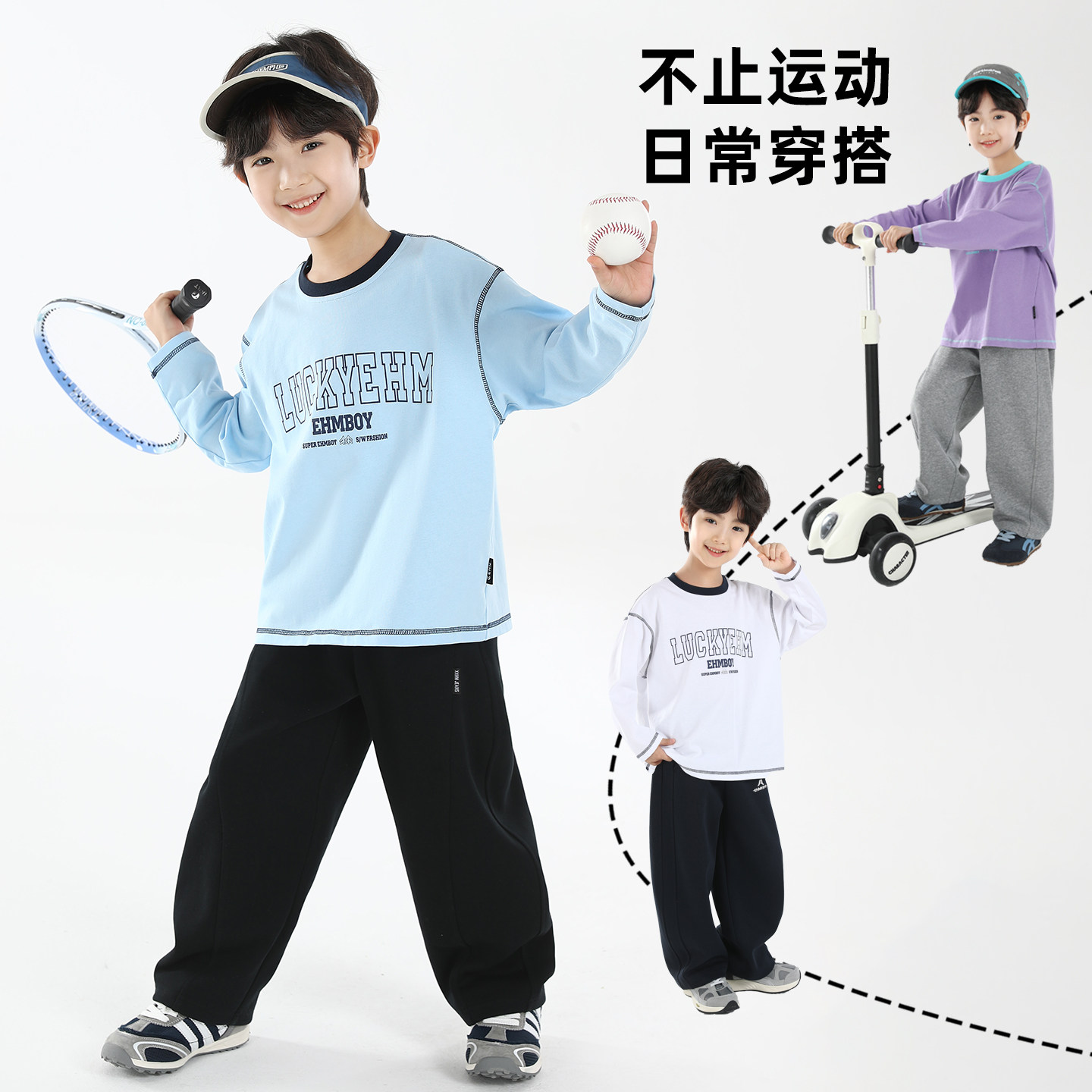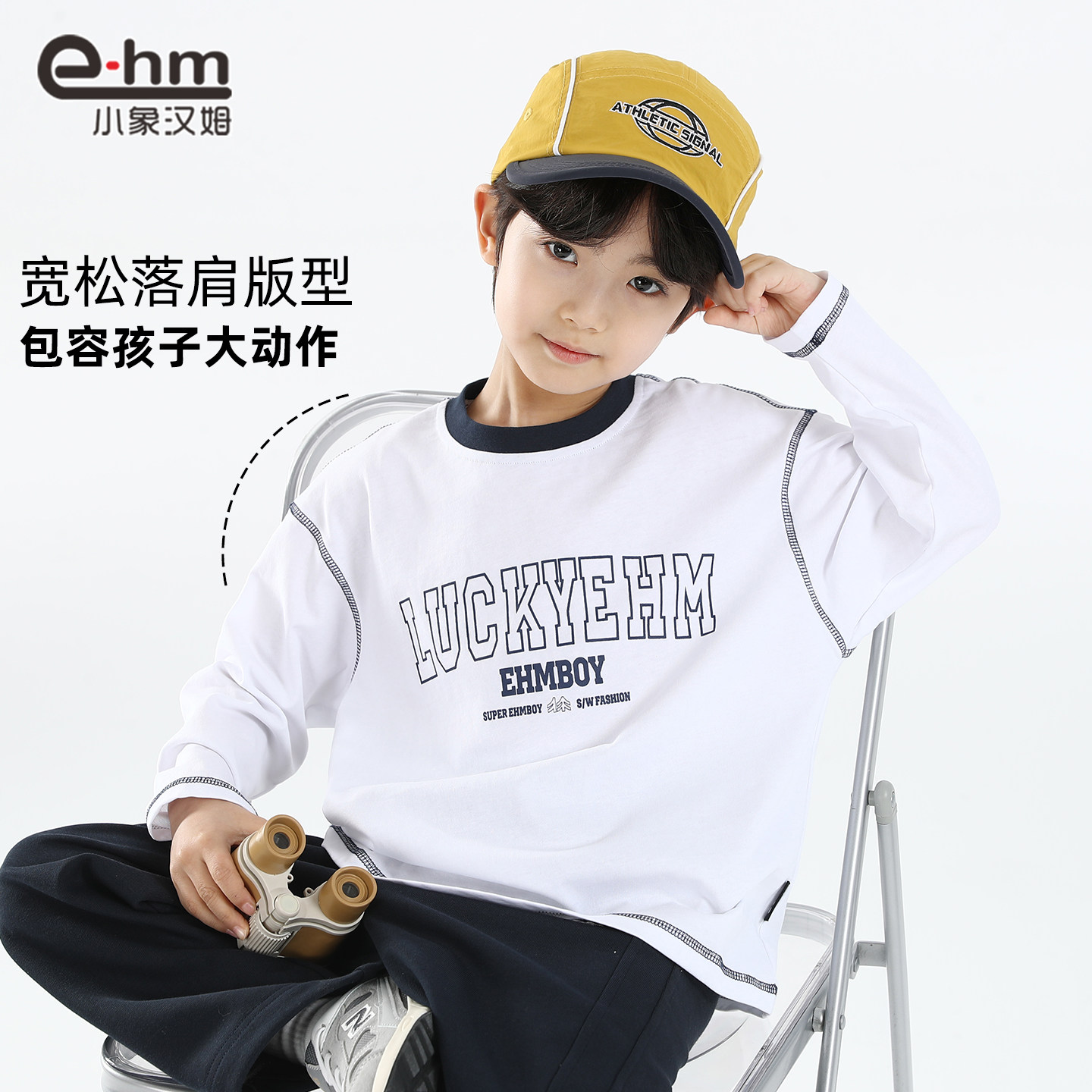 小象汉姆童装男童长袖T恤纯棉儿童打底衫白色2026春装新款男孩A类