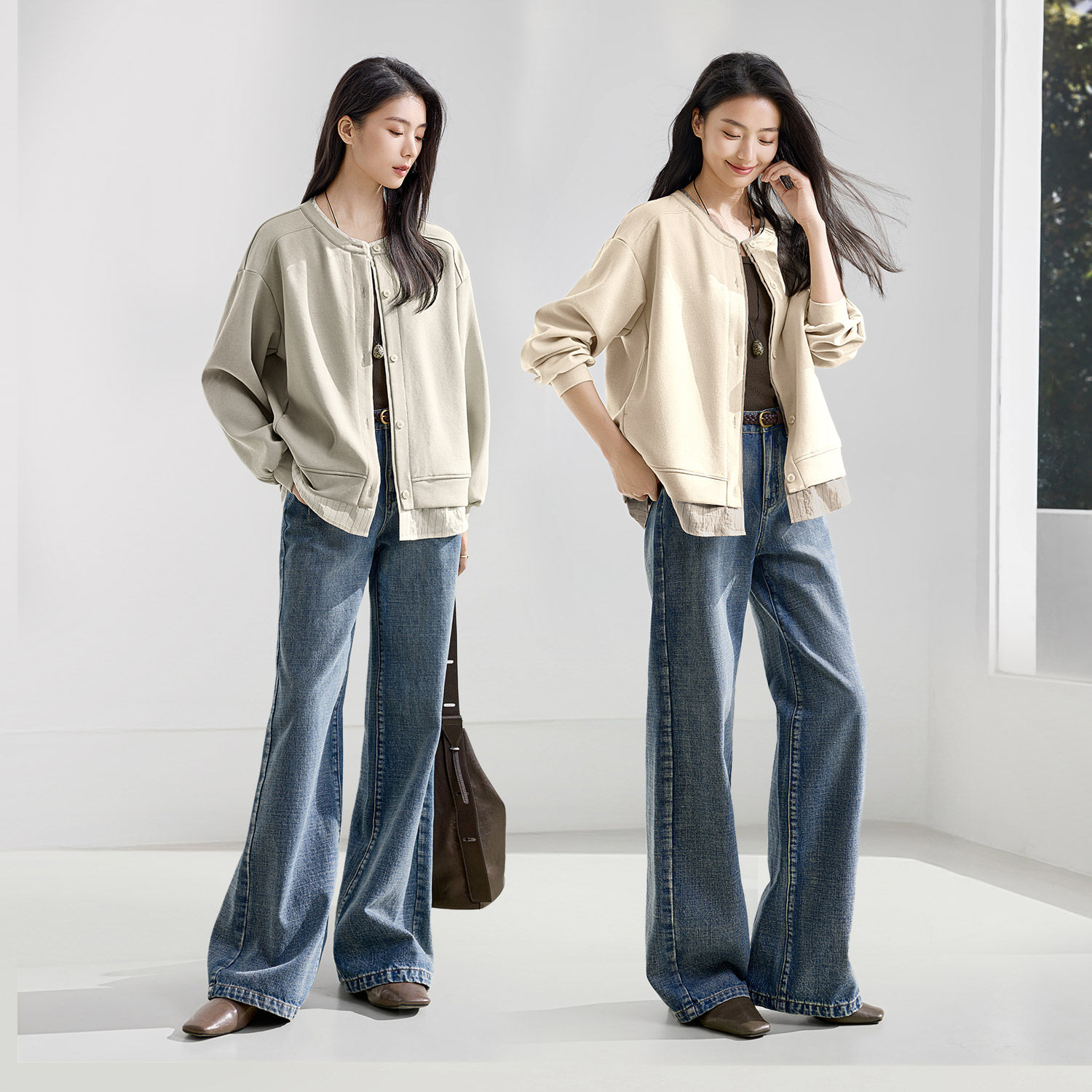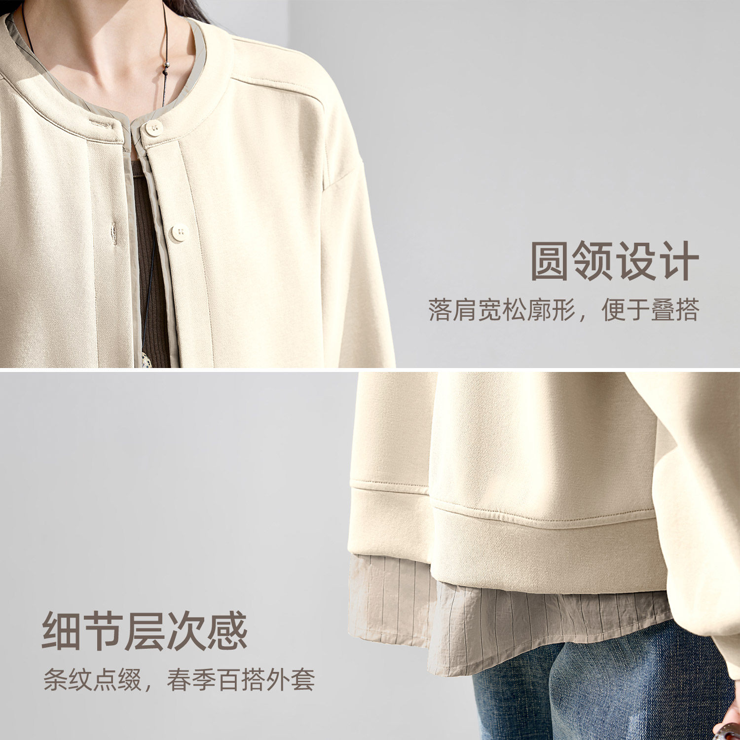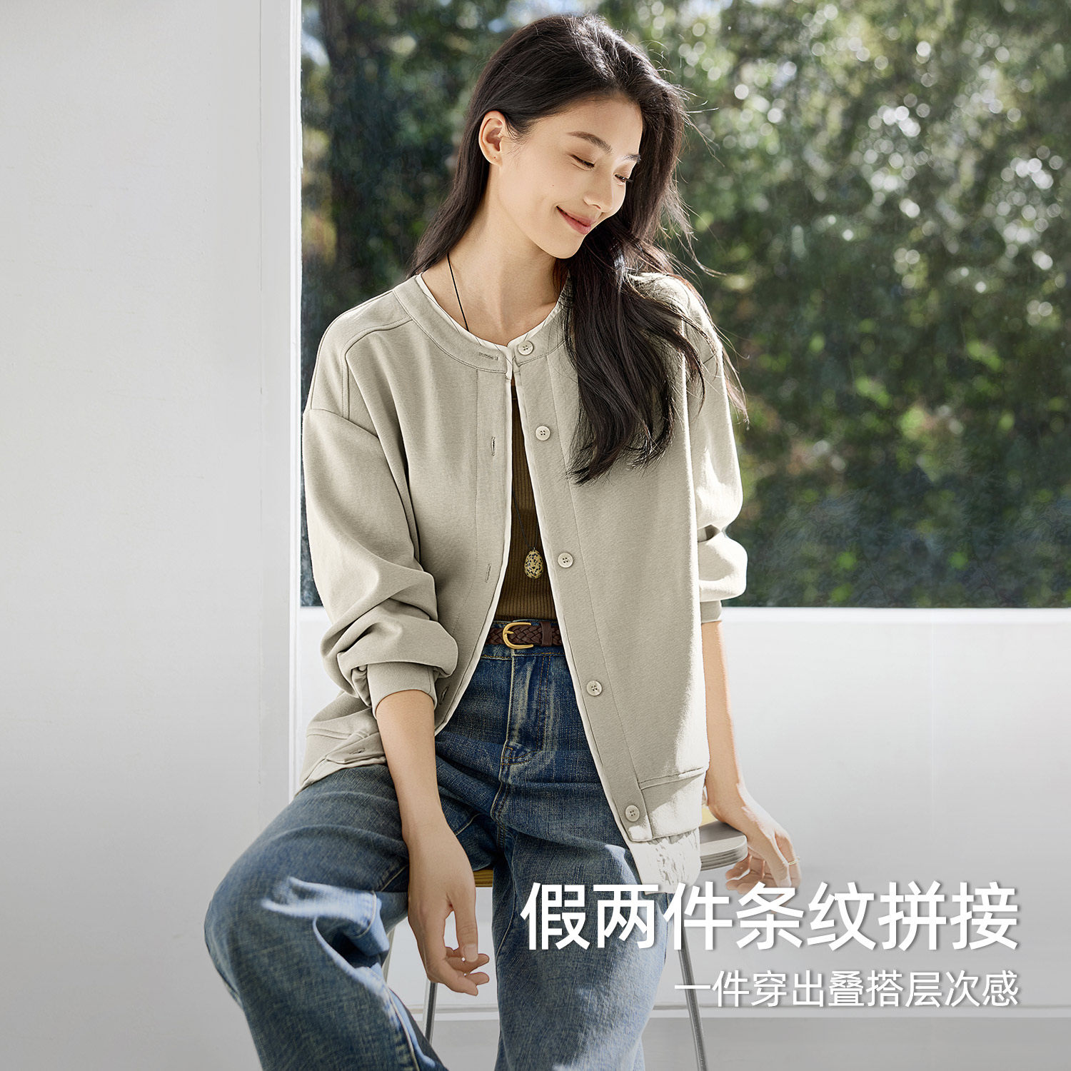 IHIMI海谧假两件圆领条纹拼接卫衣外套女款春季休闲宽松显瘦上衣