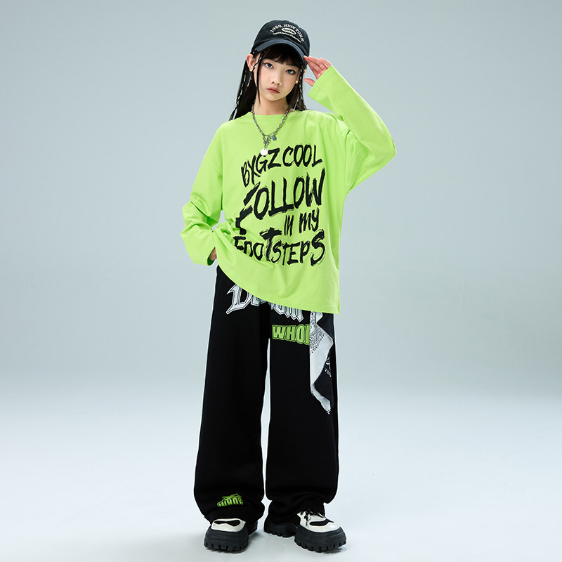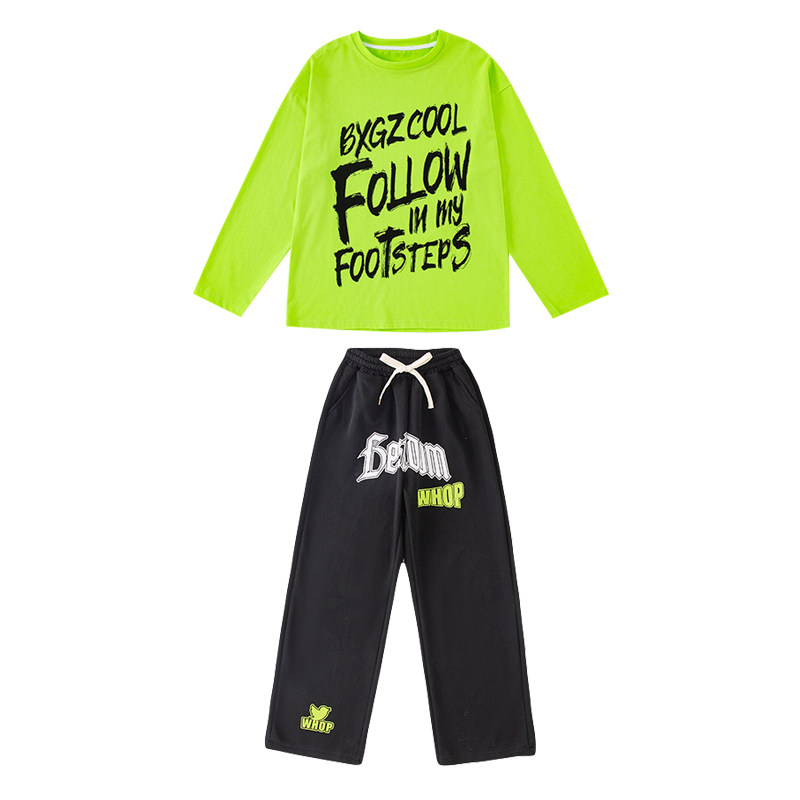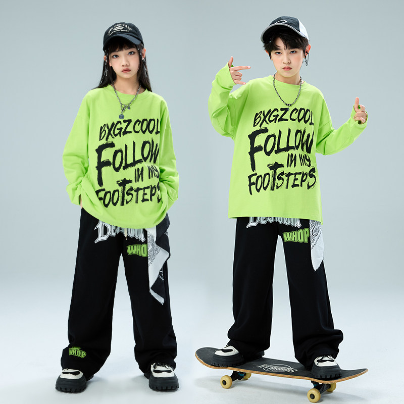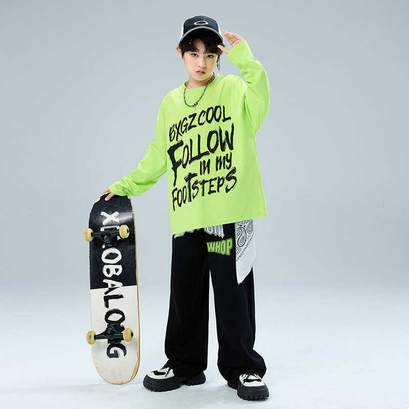 街舞儿童演出服男童套装hiphop少儿嘻哈潮牌T恤荧光绿色长袖酷帅