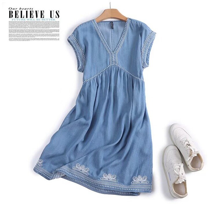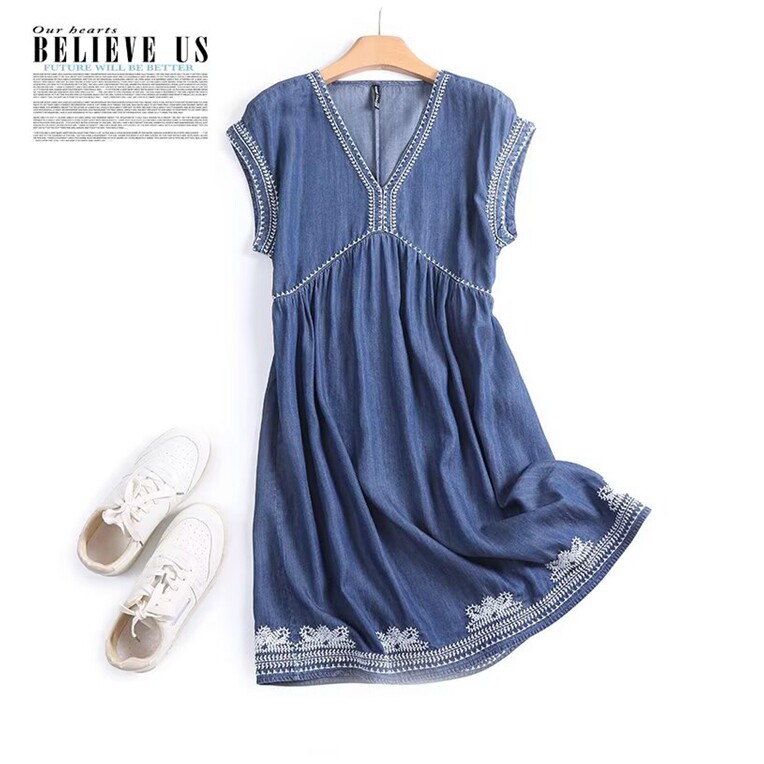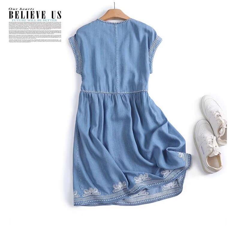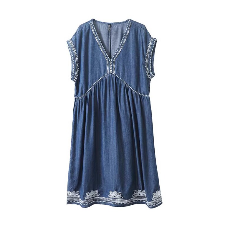 外贸女装2025夏季新款V领文艺刺绣天丝连衣裙女薄款小个子牛仔裙