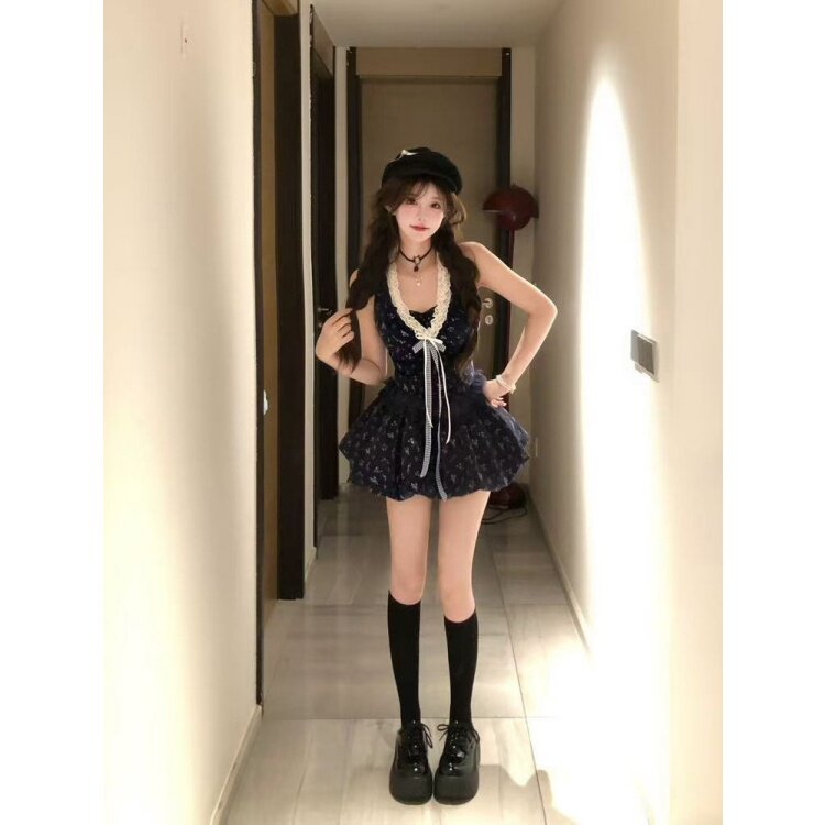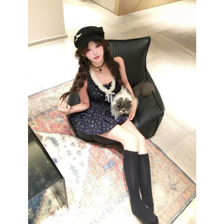 大码胖MM法式气质绝美碎花吊带连衣裙女夏季新款收腰短款蓬蓬裙子