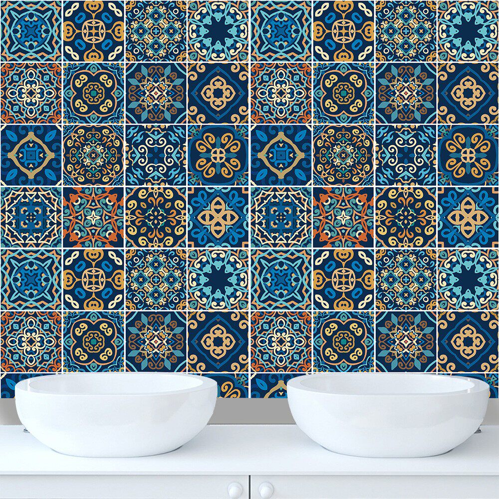 蓝色仿瓷砖贴地板楼梯柜子墙面厨房浴室美化装饰画防水自粘墙贴纸