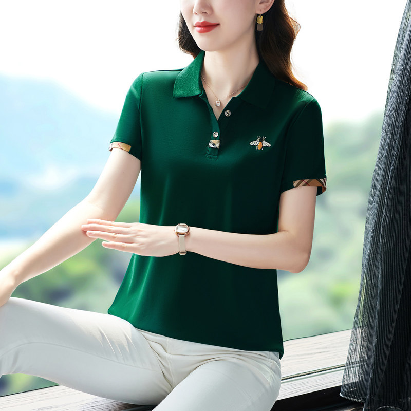 品牌冰丝短袖t恤女夏装气质妈妈polo衫宽松显瘦大码上衣绣花翻领