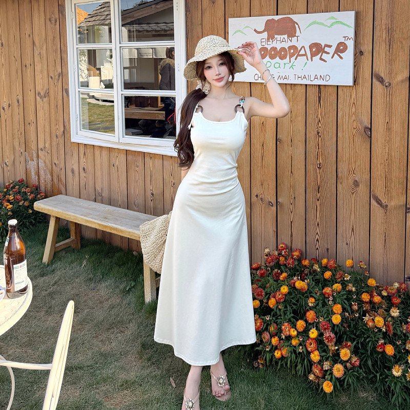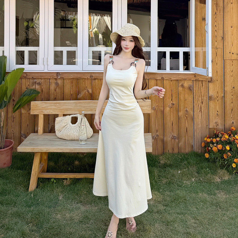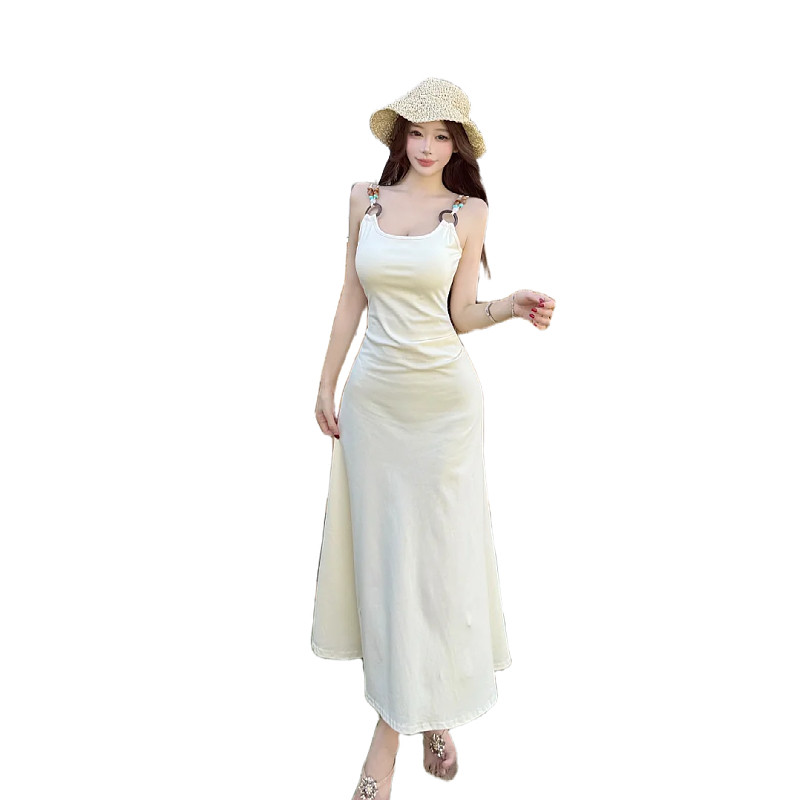 实拍法式茶歇白色吊带连衣裙子夏新款小个子收腰海边度假A字长裙