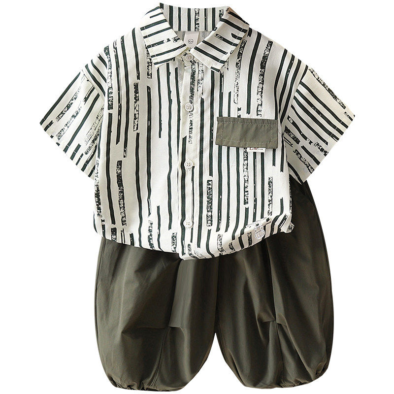 儿童条纹衬衫套装男童短袖衬衣夏装三件套宝宝时尚网红夏季潮童装