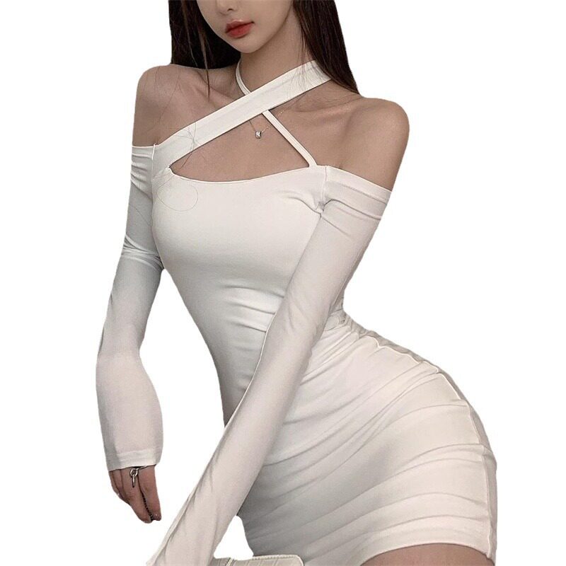 150小矮个子长款高腰休闲绑带一字肩长袖修身包臀女短款连衣裙xxs