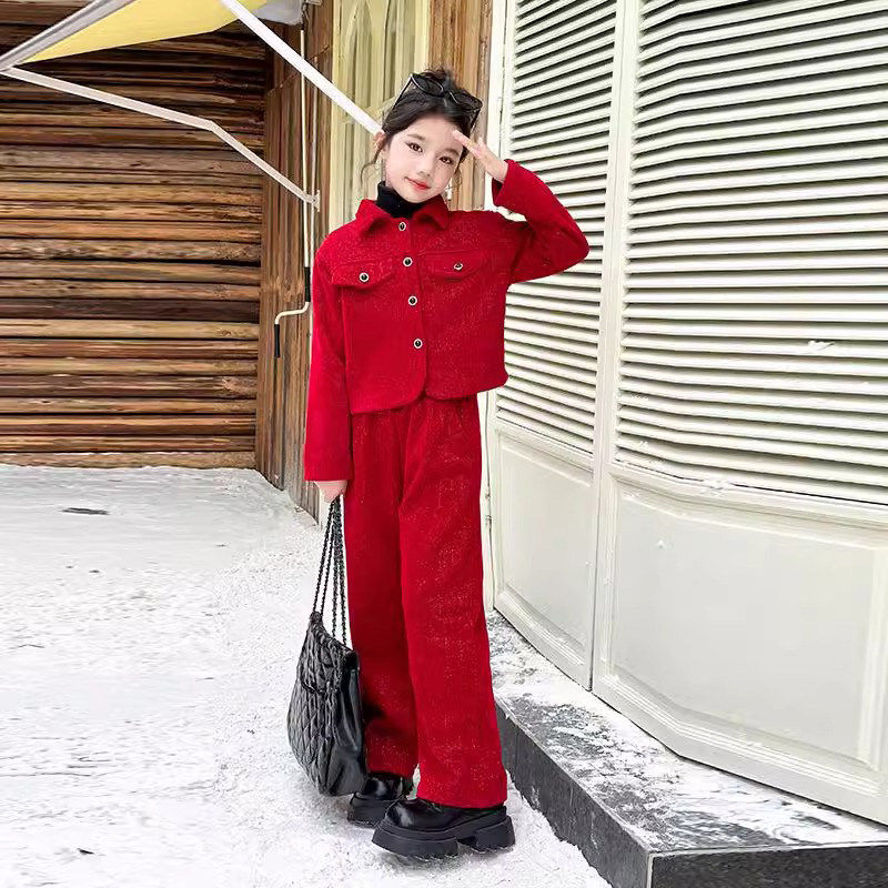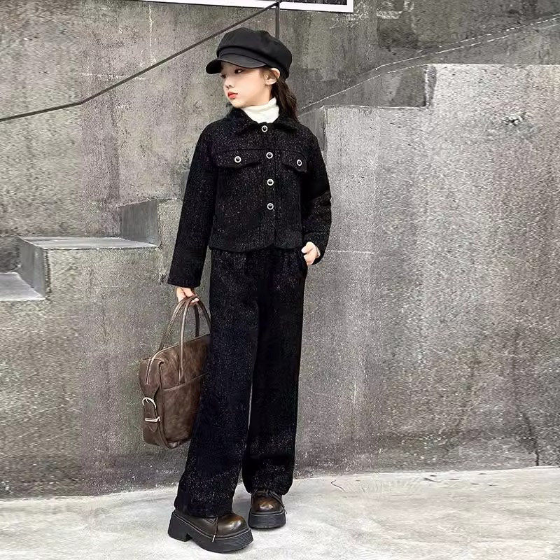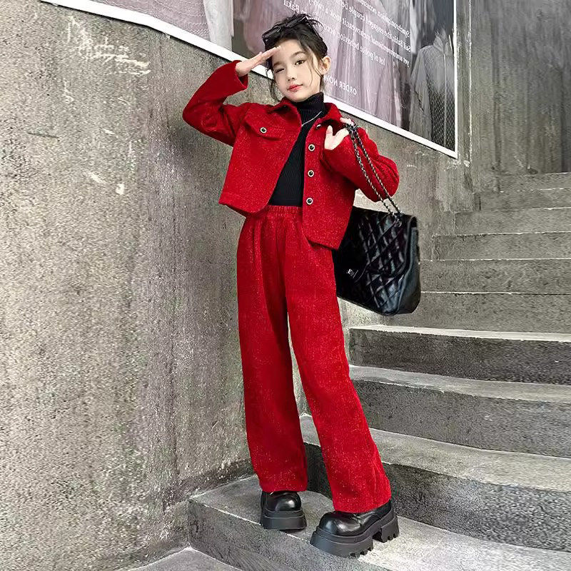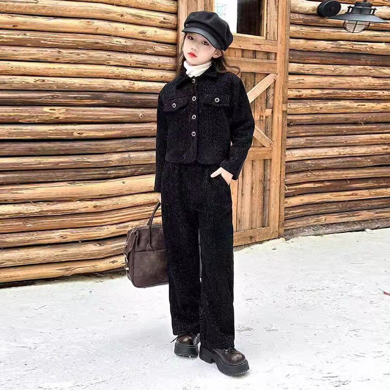 女童小香风套装秋冬季韩版中大童时髦洋气加绒加厚外套裤子两件套